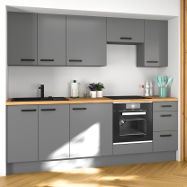 - Dolní a vysoké skříňky mají výškově nastavitelné nožičky (13,5–16 cm), díky kterým kuchyni snadno přizpůsobíte svému prostoru. Pro kompletní vzhled doporučujeme doobjednat sokl, pracovní desky a další příslušenství, které nejsou součástí základní ceny.