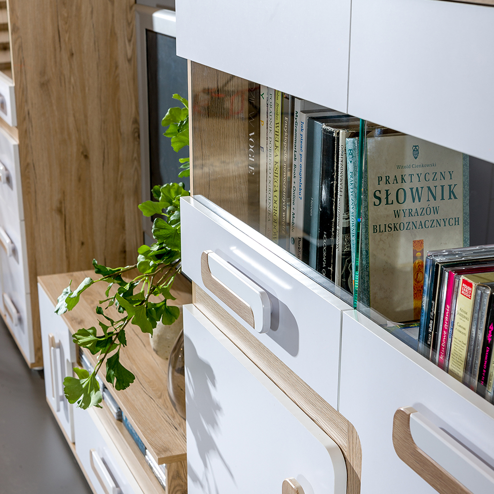 Sestava 1 Apetito - Hledáte obývací pokoj v neutrálních barvách? Apetito v barevné kombinaci dub světlý/bílá bude pro Vás tou pravou volbou. Tato barevná kombinace osvěží a prosvětlý i menší pokoje. Kombinace je neutrální a je vhodná do každého obýváku. Díky nadčasovému designu se ani po letech neokouká. Nábytek je vyroben z kvalitní laminátové dřevotřísky o síle 16 mm s ochrannou ABS hranou. Záda tvoří HDF desky. Zásuvky jsou opatřeny ložiskovými pojezdy, které zajistí hladký posun. Zboží Vám dodáme v demontu s podrobným návodem na sestavení a kováním.