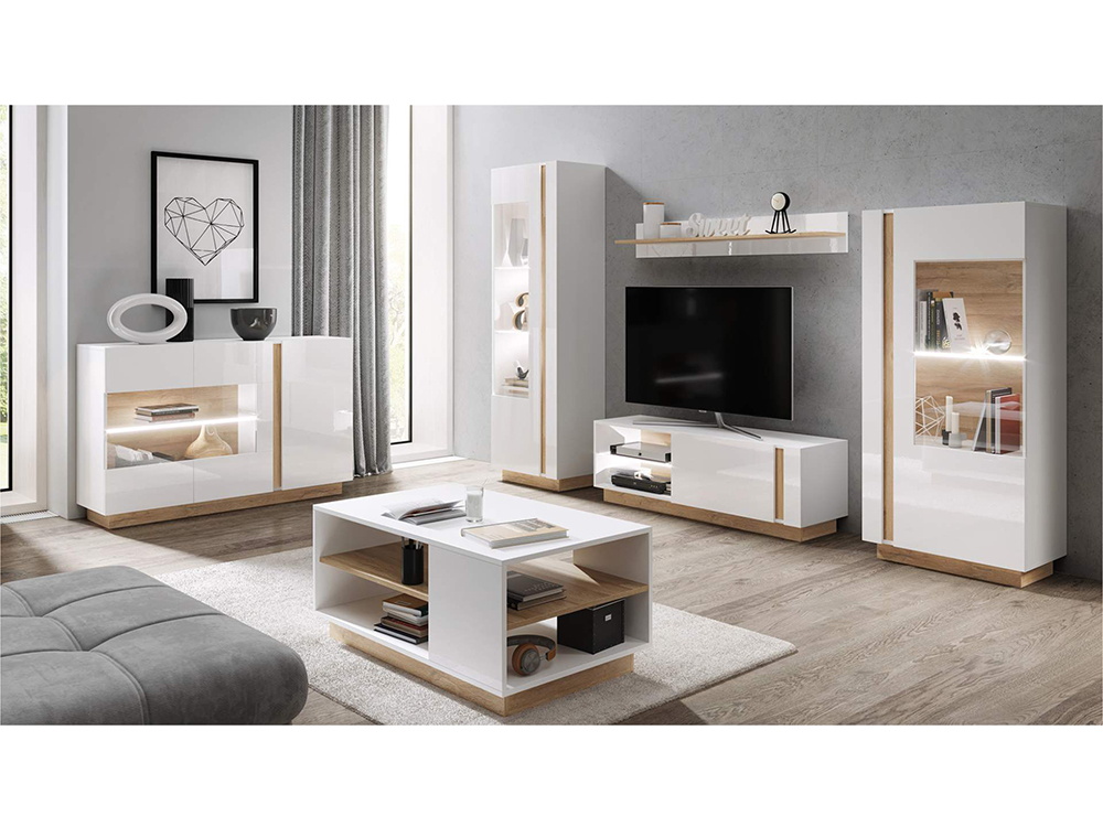 Nábytkový systém Arco rozjasní a osvěží Váš obývací pokoj. Arco nabízíme v netradiční barevné kombinaci bílá mat/dub grandson/bílá lesk. Kolekci Arco si můžete objednat po jednotlivých dílech i v předdefinovaných sestavách. Nábytek je vyroben z kvalitní laminátové dřevotřísky o síle 16 mm s ochranou ABS hranou. Zboží Vám dodáme v demontu s návodem na sestavení a kováním.