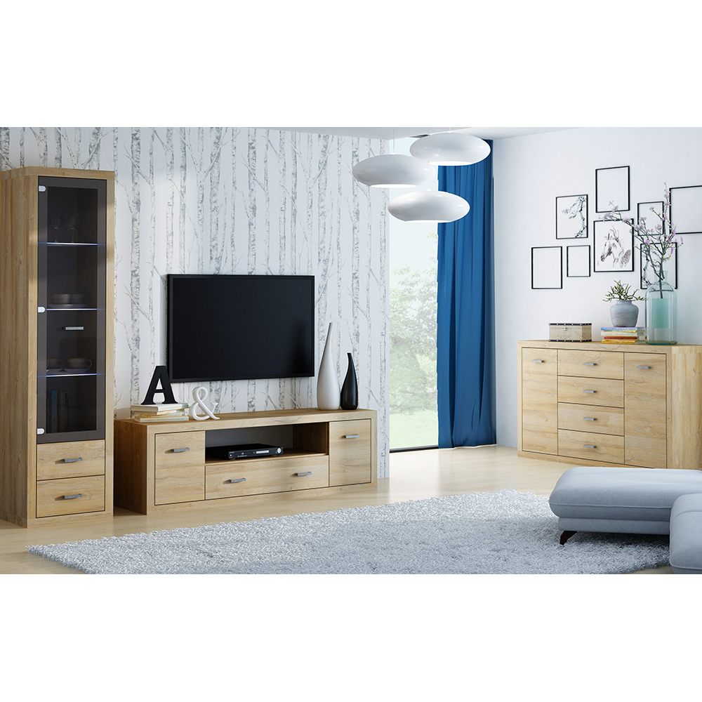 Obývací pokoj A - Nábytkový systém Orlando vnese do Vašeho domova teplé dřevěné tóny dubu grandson. Kolekce nabízí širokou škálu jednotlivých elementů, kterými si sladíte obývací pokoj i ložnici. Nábytek je vyroben z kvalitní laminátové dřevotřísky o síle 16 mm. Vrchní a spodní desky jsou zesílené na 48 mm a dodávají tak nábytku masivní vzhled. Zboží Vám dodáme v demontu s podrobným návodem na sestavení a kováním. Zásuvky disponují kovovými madly a kuličkovými pojezdy. K vitrínám Vám doporučujeme zakoupit LED osvětlení, které zpříjemní tmavé večery v obývacím pokoji či ložnici.