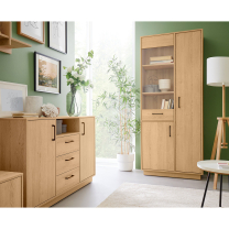 Obývací pokoj Santiago v příjemném dekoru dub propůjčí Vašemu interiéru neobvyklé kouzlo. Nábytek je vyroben z kvalitní laminátové dřevotřísky LTD o síle 16 mm s ochrannou ABS hranou. Záda tvoří HDF desky v dekoru dubu. Kolekci Santiago Vám nabízíme v předdefinovaných sestavách i po jednotlivých dílech. Díky tomu si můžete svůj domov vybavit podle přání. Dvířka a přední čela zásuvek jsou opatřeny elegantními kovovými úchytkami v černé barvě. K vitrínám doporučujeme objednat LED osvětlení, které navodí příjemnou atmosféru během tmavých večerů. Nábytek Vám dodáme v demontu s podrobným návodem na sestavení a kováním. Montáž není náročná.