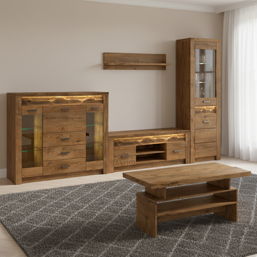 DomůObývákObývákové kolekceObývák INDIANAPOLIS | jasan světlýObývací stěna INDIANAPOLIS s sestava A | 330 cm + stolek 120x60 cm | jasan světlý