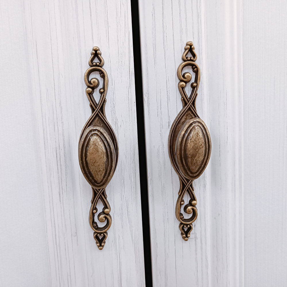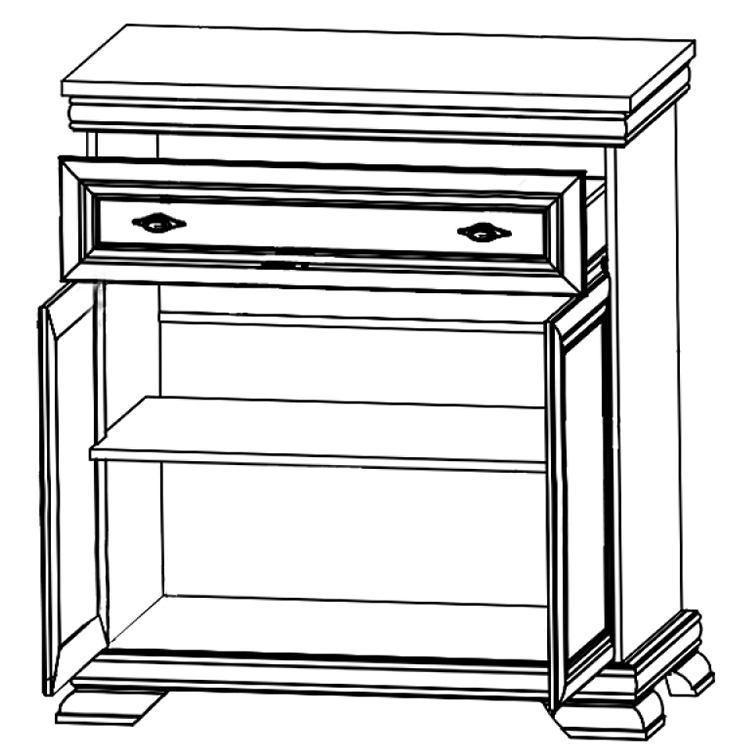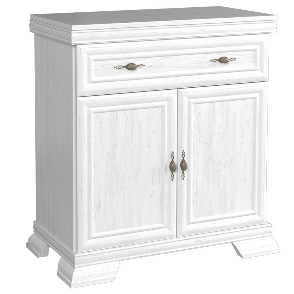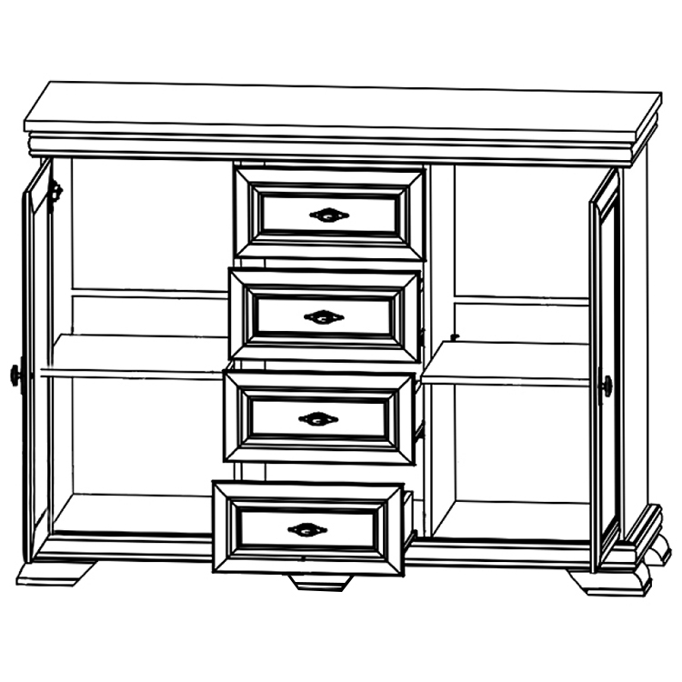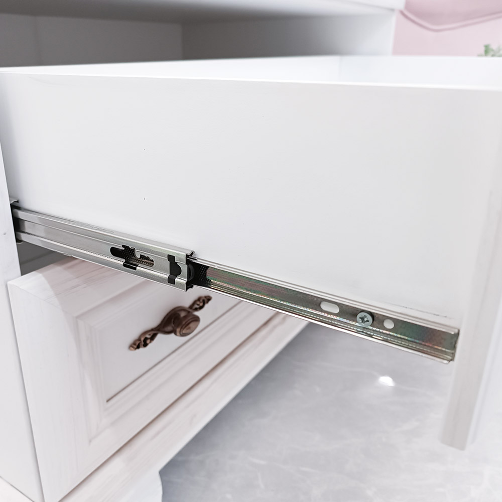 Kovové úchytky s jemnou patinou podtrhují klasický vzhled kolekce a zásuvky s ložiskovými pojezdy umožňují tichý a plynulý chod.
