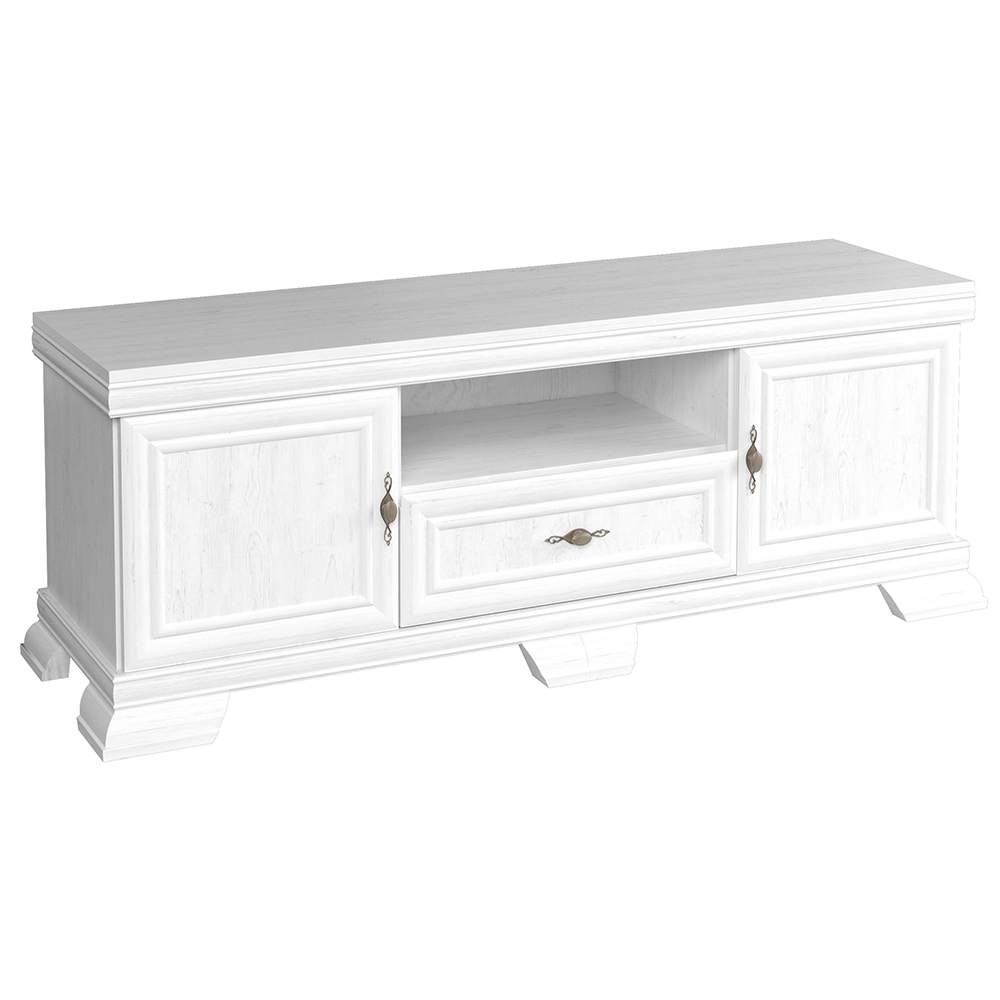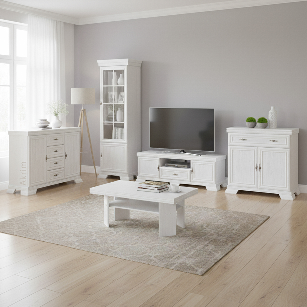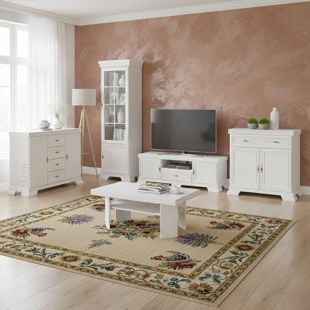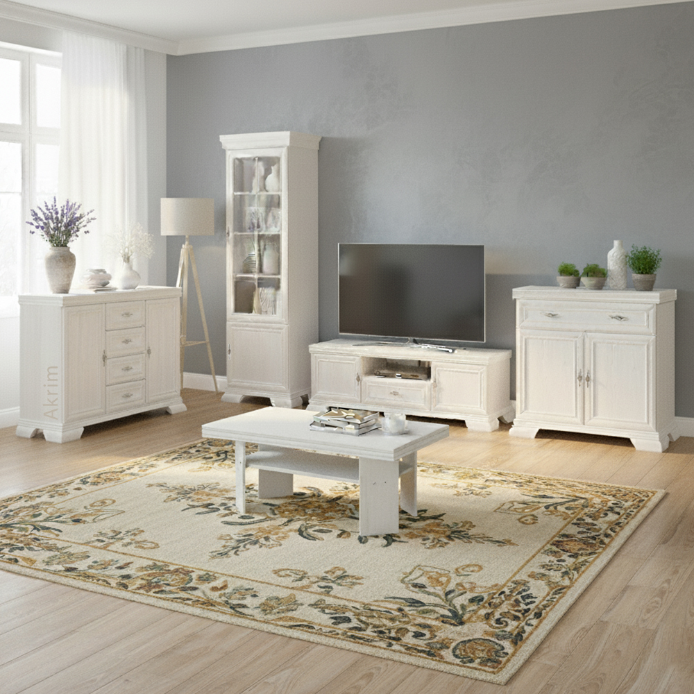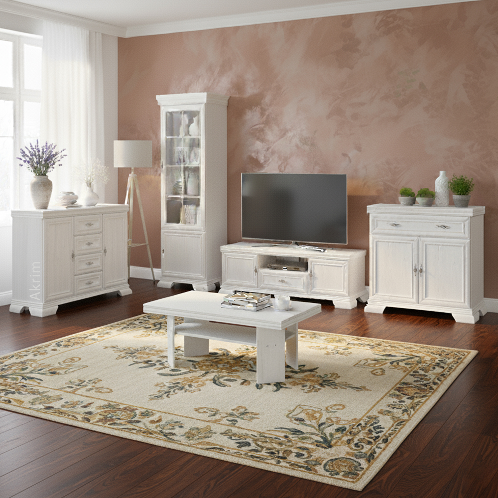 Obývací stěna KORA patří do oblíbené kolekce nábytku, která osloví všechny milovníky klasického a romantického stylu. Kombinace ozdobných lišt, kovových úchytek s patinou a elegantních tvarů dodává celému interiéru nádech luxusu a útulnosti.