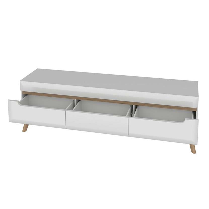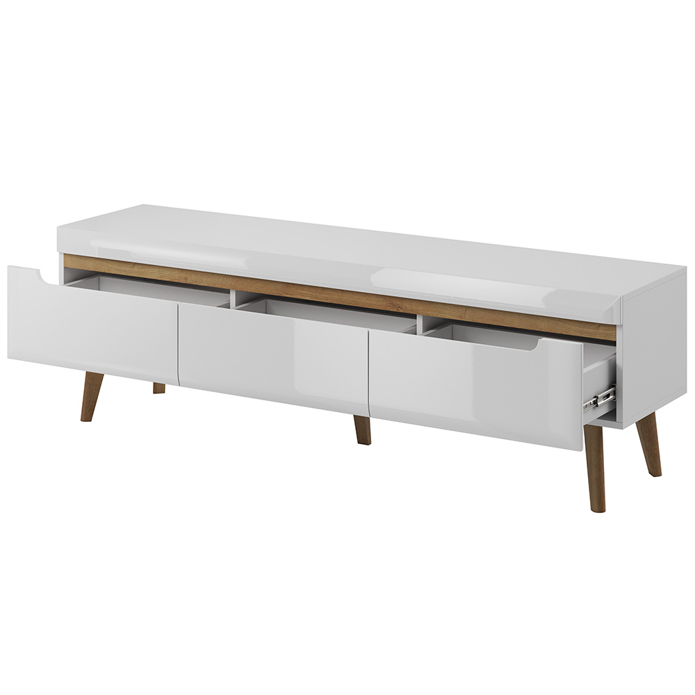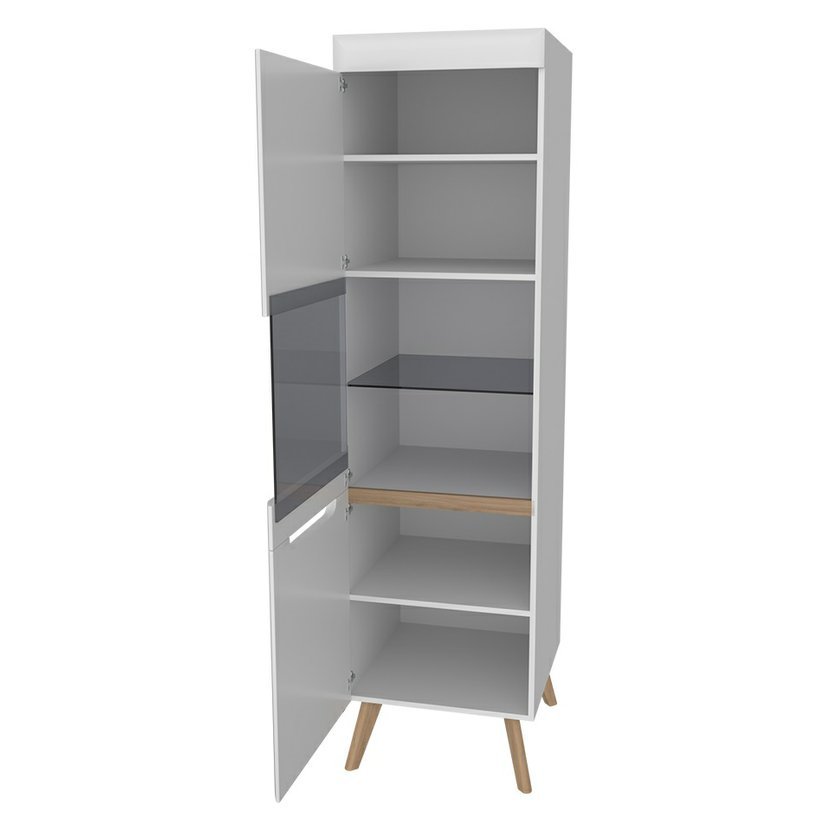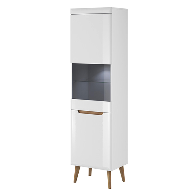 Obývací systém Nordi patří mezi moderní typ nábytku s nádechem retro stylu. Tuto kolekci nabízíme v atraktivní kombinaci bílá lesk/dub riviera a dub artisan/černá. K vitrínám je možné dokoupit LED osvětlení, které vytvoří příjemnou atmosféru ve večerních hodinách. Lze si zakoupit celou sestavu nebo i jednotlivé díly. Nábytek je vyroben z kvalitní laminátové dřevotřísky s ochranou ABS lištou. Nohy jsou dřevěné a vysoké 20 cm. Skleněné poličky jsou z tvrzeného skla.
