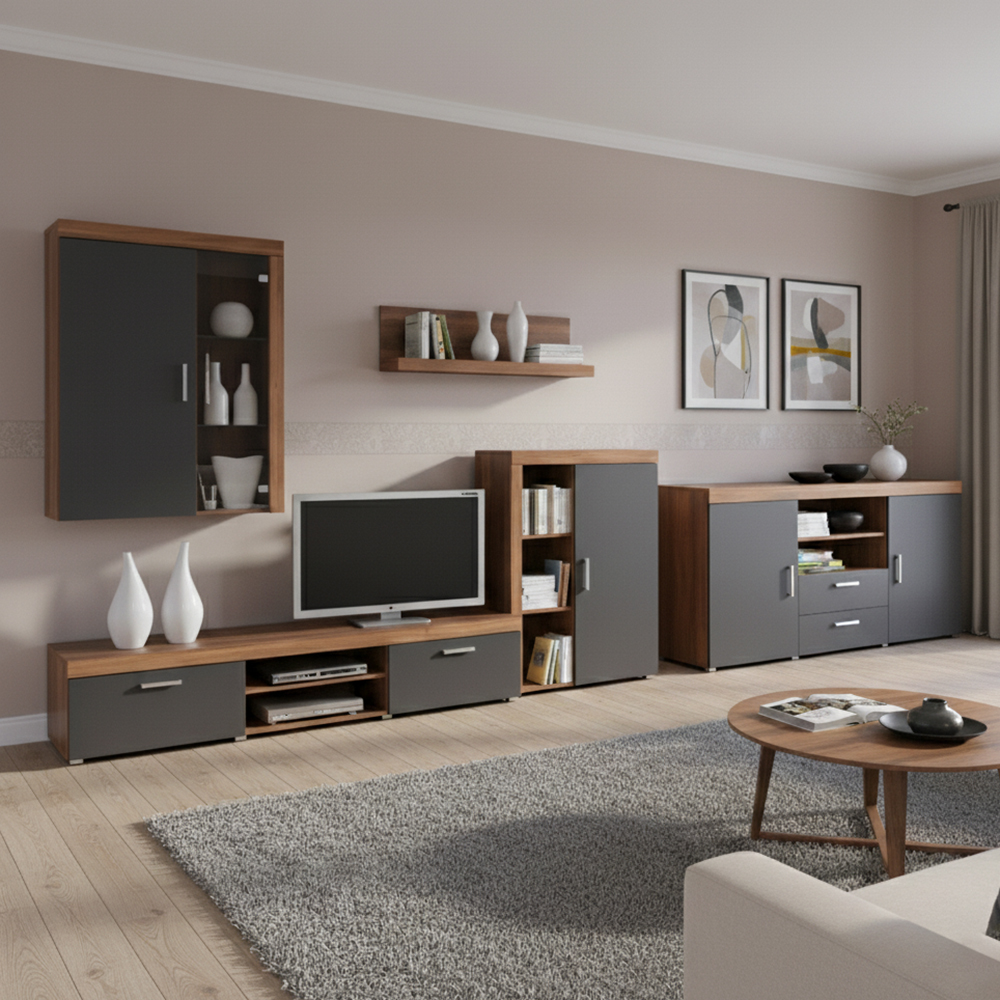 Sestava C - Obývací systém Samba je zajímavý nejen svým moderním designem, ale také dobrou kvalitou zpracování a nízkou cenou. Lze si u nás objednat, jak celou sestavu, tak i jednotlivé díly, se kterými si vytvoříte obývací pokoj podle svých představ. Nábytek Vám dodáme v demontu s návodem na sestavení a kováním.