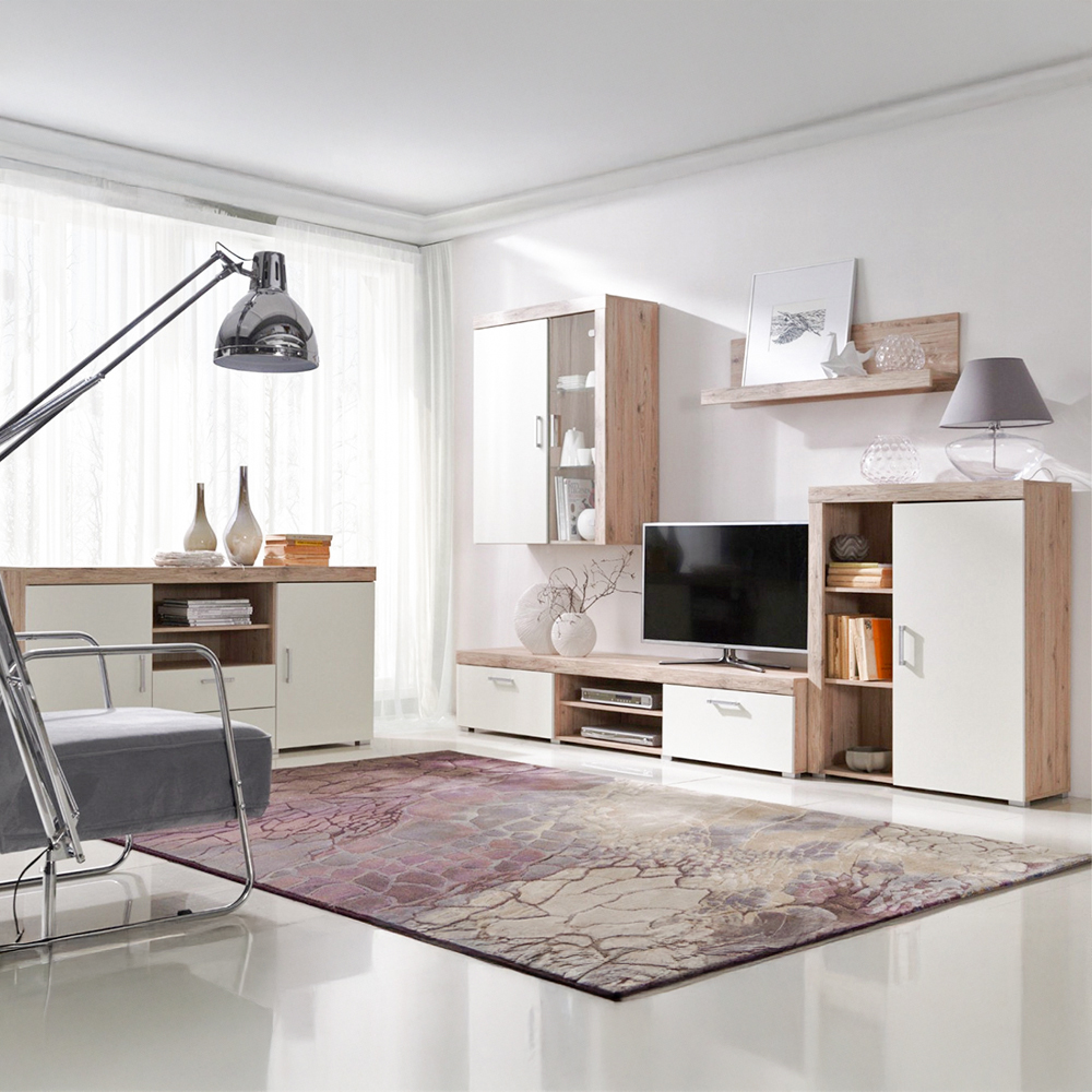 Obývací pokoj Samba představuje nábytek v decentním stylu. Kombinace dřevěného dekoru san marino a krémového odstínu zajistí ve Vašem domě příjemné prostředí. Celá kolekce Samba nabízí různé sestavy i jednotlivé díly, ze kterých si naplánujete obývací pokoj podle svých představ.
