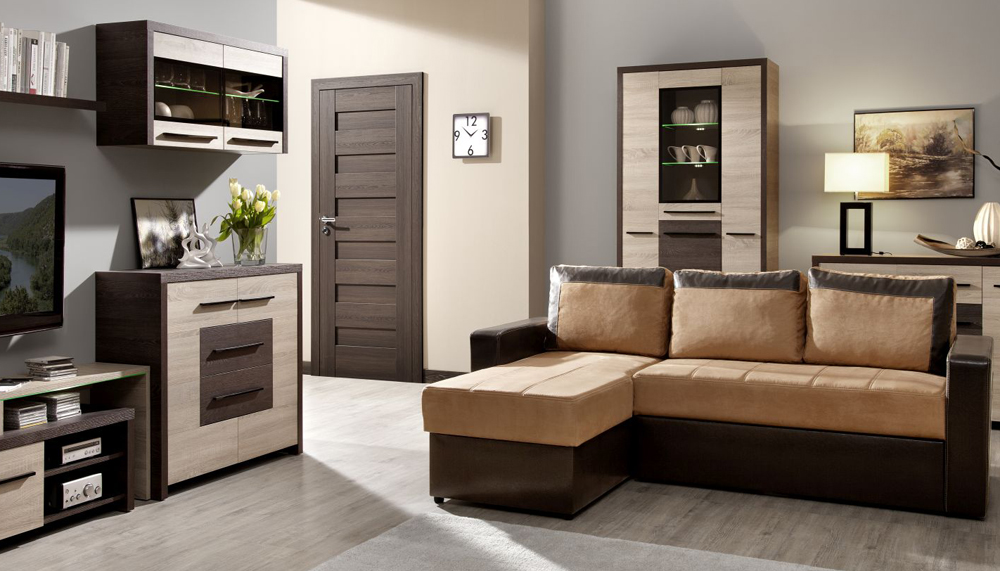 Dvoulůžko Kolder - Obývací systém Kolder osvěží Váš obývací pokoj nebo ložnici díky osvětleným vitrínám v kombinaci s rustikálním vzhledem. Kolekce Kolder je vyrobena z kvalitní laminátové dřevotřísky. Systém nabízíme v neobyčejné kombinaci dub sonoma/dub canterbury. Zboží Vám dodáme v demontu s návodem na sestavení a kováním.