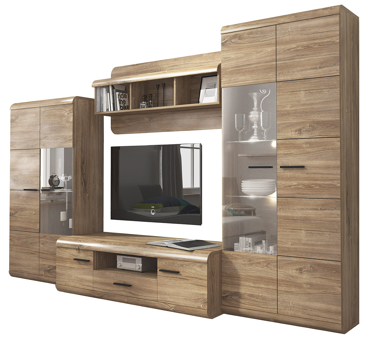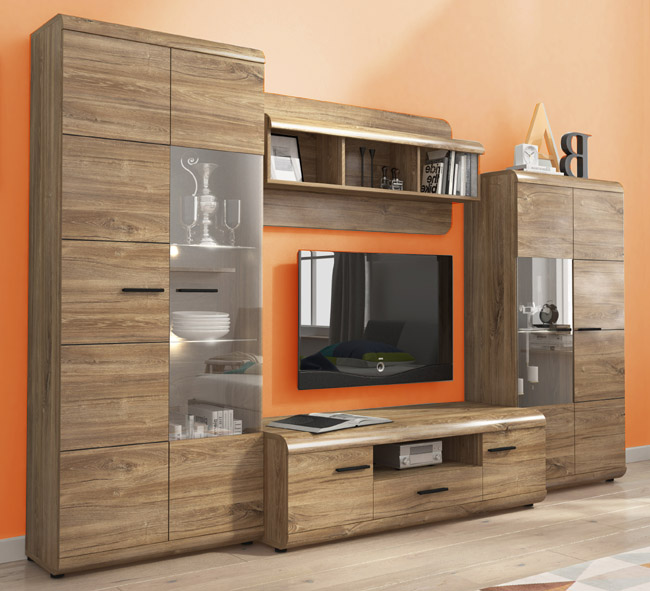 Obývací stěna - Obývací systém Link dodá Vašemu pokoji moderní vzhled. Díky jednotlivým dílům si můžete obývací pokoj sestavit podle svých představ. Tuto kolekci nabízíme v netradičním odstínu dub stirling, který se vyznačuje kontrastním dekorem dřeva. K některým dílům si lze objednat LED osvětlení, které zpříjemní večery v obývacím pokoji. Nábytek je vyroben z kvalitní laminátové dřevotřísky s ochranou ABS hranou. Zboží Vám dodáme v demontu s návodem na sestavení a kováním.