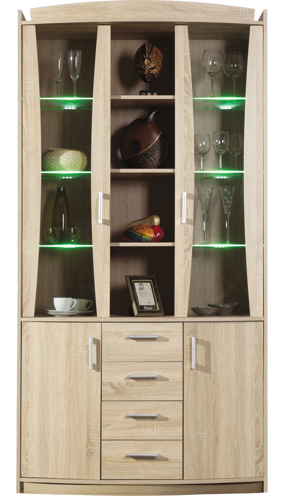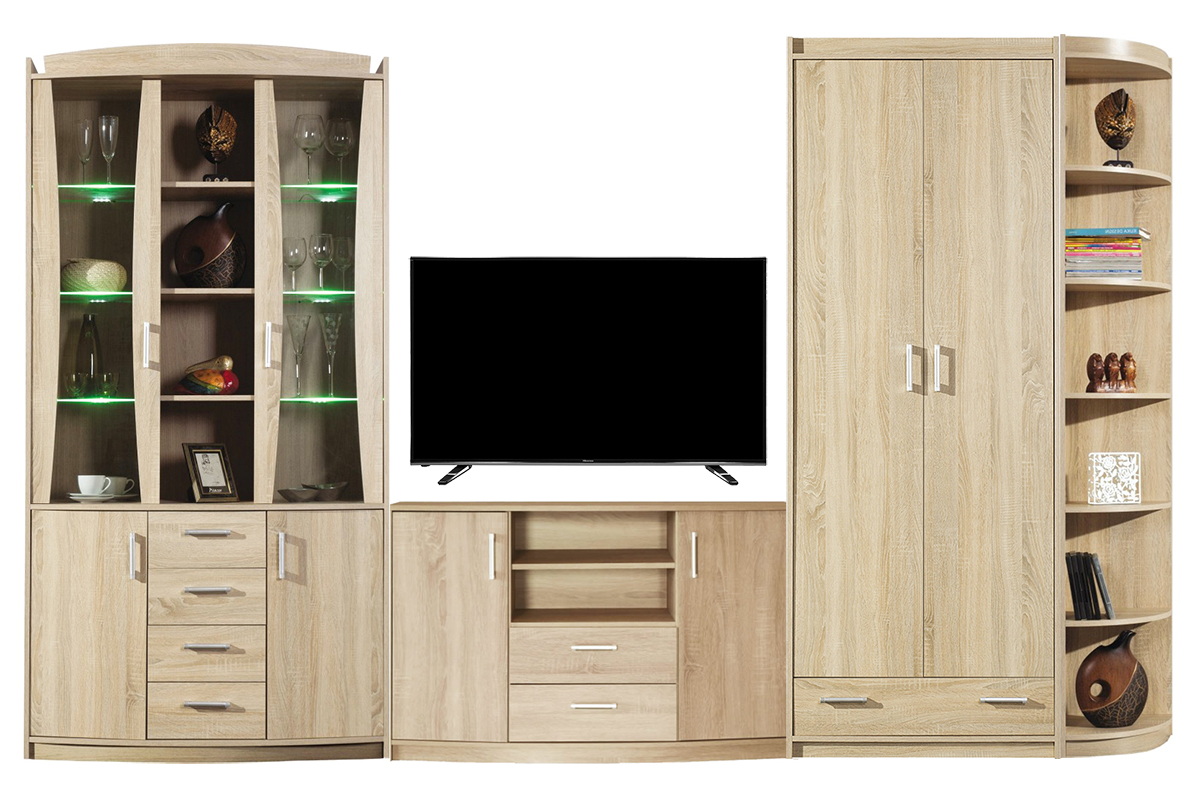 Obývací systém Mega vyniká především svou variabilitou a velkým množstvím úložného prostoru. Jedná se o sektorový nábytek, a proto si můžete sestavit jednotlivé díly podle svého přání. Materiál použitý na výrobu tohoto nábytkového systému je kvalitní laminátová dřevotříska. Hrany jsou chráněny ABS hranou. Sektorový nábytek Mega nabízíme v provedení - dub sonoma nebo dub trufla. Prosklené vitríny je možné doplnit LED diodovým podsvícením skleněných poliček (viz fotografie). Zboží je dodáváno v demontu.
