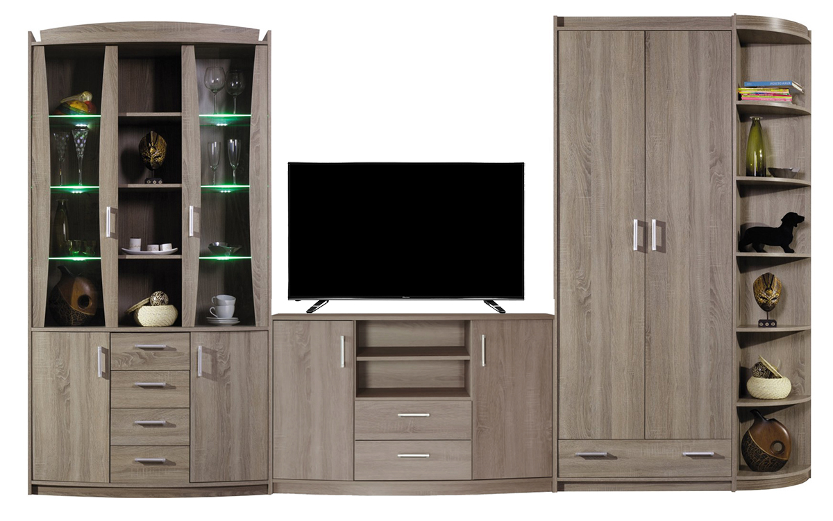 Obývací systém Mega vyniká především svou variabilitou a velkým množstvím úložného prostoru. Jedná se o sektorový nábytek, a proto si můžete sestavit jednotlivé díly podle svého přání. Materiál použitý na výrobu tohoto nábytkového systému je kvalitní laminátová dřevotříska. Hrany jsou chráněny ABS hranou. Sektorový nábytek Mega nabízíme v provedení - dub sonoma nebo dub trufla. Prosklené vitríny je možné doplnit LED diodovým podsvícením skleněných poliček (viz fotografie). Zboží je dodáváno v demontu.