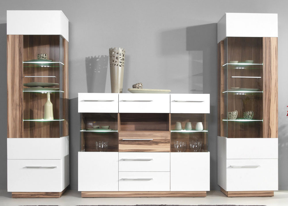 TV stolek Monsun MN7 - Obývací systém Monsun je zajímavý především svým neobyčejným moderní designem. U tohoto obývacího systému Vás okouzlí nejen hra s jednotlivými liniemi, ale i velice vkusná kombinace dvou barevných odstínů, které tak umocňují její originální dynamický vzhled. Většina elementů je opatřena LED diodovým podsvícením skleněných poliček (viz fotografie). Materiál použitý na výrobu tohoto nábytkového systému je kvalitní laminátová dřevotříska. Hrany jsou chráněny ABS lištou. Systém je v provedení ořech baltimore/černá nebo ořech baltimore/bílá. Zboží je dodáváno v demontu.