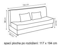 Pohovka Sonia je ideálním řešením do menších prostorů. Sonia se snadno rozkládá pro příležitostné spaní. Systém rozkladu je typu "klick-klack". Její součástí je i praktický úložný prostor pod sedákem. Pohovka je vyrobena z měkkého i masivního dřeva. Sedák tvoří kombinace PUR pěny a faliste pružin. Sed působí pevně. Pohovka není vhodná do prostoru. Zadní strana je potažena černou krycí tkaninou. Pohovku Vám dodáme smontovanou. Cena zahrnuje i dva menší polštářky.
