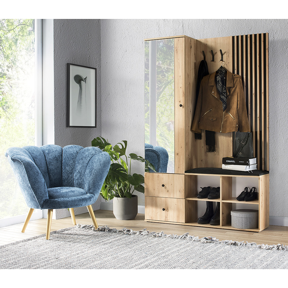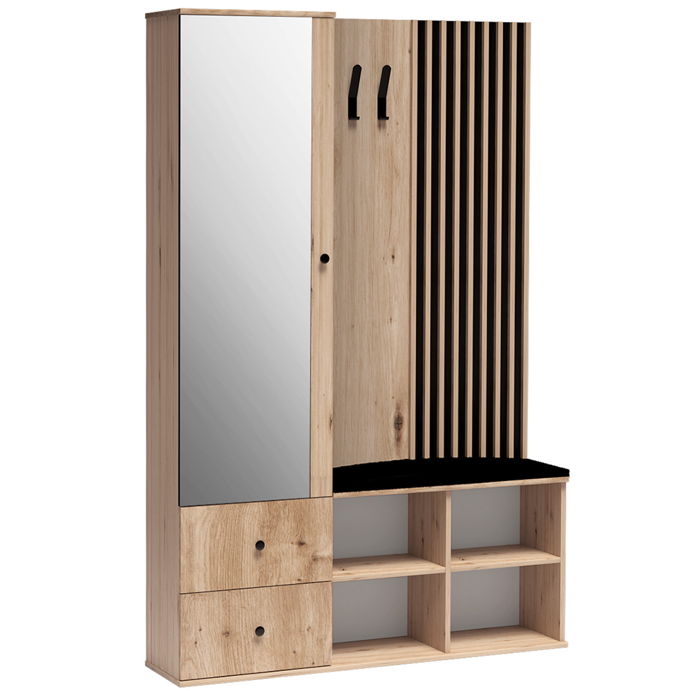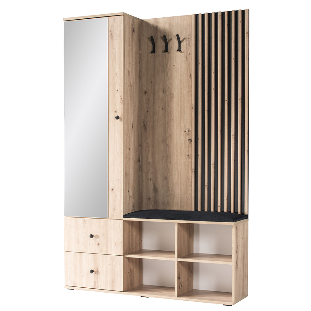 Předsíňová stěna CALI + šatní skříň C-1- Nábytkový systém Cali nabízí širokou škálu jednotlivých dílů, ze kterých si snadno sestavíte obývací pokoj, ložnici, jídelnu i předsíň. Kolekce Cali přináší nejnovější styl nábytku. Kombinace dřevěného dekoru artisan s černou a lamelami vytvoří ve vašem domově moderní a neokázalé prostředí. K některým jednotlivým dílům si lze objednat kovové černé nohy, které plní nejen estetický dojem ale zároveň je oceníte i při úklidu. Stylové nohy jsou vysoké 10 cm. Nábytek Cali je vyroben z kvalitní laminátové dřevotřísky o síle 16 mm s ochrannou ABS hranou. Spodní a horní desky jsou zesílené a dodávají tak nábytku masivní vzhled. Záda zpevňují HDF desky s omyvatelnou vnitřní stranou. Ozdobné lamely jsou vyrobeny z MDF desek. Dvířka jsou opatřena panty s tichým dovíráním. Stačí dvířka trochu přivřít a ona se sama dovřou. Zásuvky disponují ložiskovými pojezdy zajišťující hladký posun. K vitrínám doporučujeme objednat i LED osvětlení, které zpříjemní tmavé večery a vytvoří příjemnou atmosféru. LED osvětlení se skládá ze zdroje světla, kabelu, vypínače a klasické zástrčky do elektrické sítě. Nábytek Vám dodáme v demontu s podrobným návodem na sestavení a kováním.