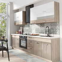 - Dvířka jsou z MDF desek (16 mm) s fólií ve vysokém lesku – bílém nebo cappuccino. Kombinace s dekorem sonoma působí moderně a zároveň útulně.
