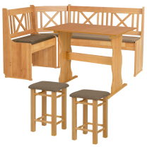 - Kompletní jídelní sestava: rohová lavice, jídelní stůl a dva taburety