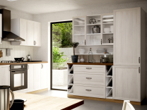 Kuchyňská linka Royal vdechne vaší kuchyni útulnou venkovskou romanitku. Díky jednotlivým dílům si lze sestavit kuchyňskou linku podle svých představ a možností. Korpus skříněk tvoří laminátové dřevotřískové desky o síle 16 mm v bílém matném odstínu. Přední části zásuvek a dvířek jsou vyrobeny z MDF desek v odstínu borovice nordická. Dekor borovice nordické je bílý s jemnou kresbou dřeva. Spodní skříňky disponují nastavitelnými nožkami z pevného plastu. Součástí skříněk je i spodní sokl v odstínu dub dziki. Úchytky jsou kovové v černém matném odstínu. Zboží Vám dodáme v demontu s návodem na sestavení a kováním.