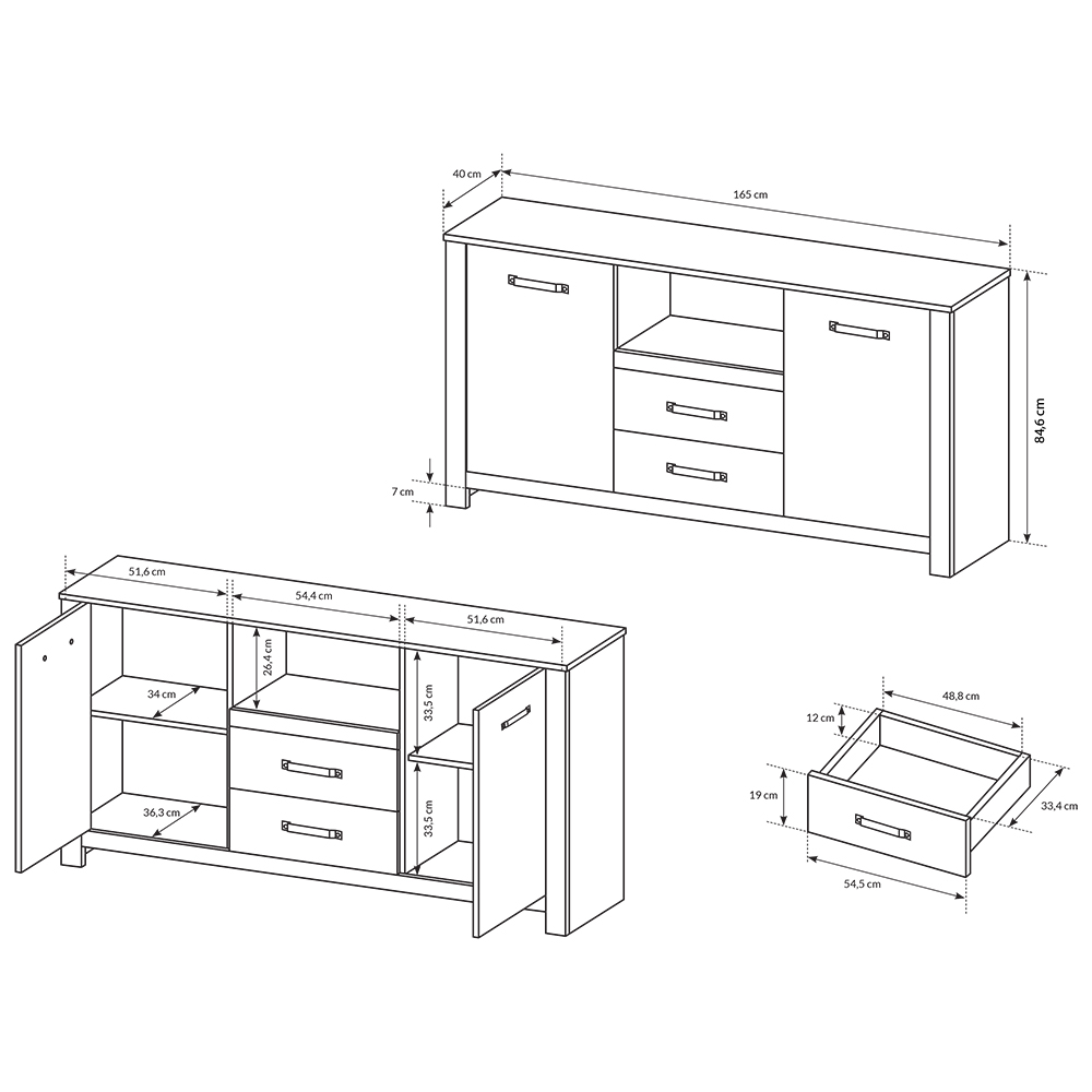 Korpus je vyroben z kvalitní laminátové dřevotřísky s ochranou ABS hranou. Zásuvky jsou opatřeny ložiskovými pojezdy pro snadný posun. Záda a dna zásuvek tvoří HDF desky s omyvatelnou vnitřní stranou. Nábytek skvěle doplňují tmavé kovové úchyty. Zboží Vám dodáme v demontu s podrobným návodem na sestavení a kováním.