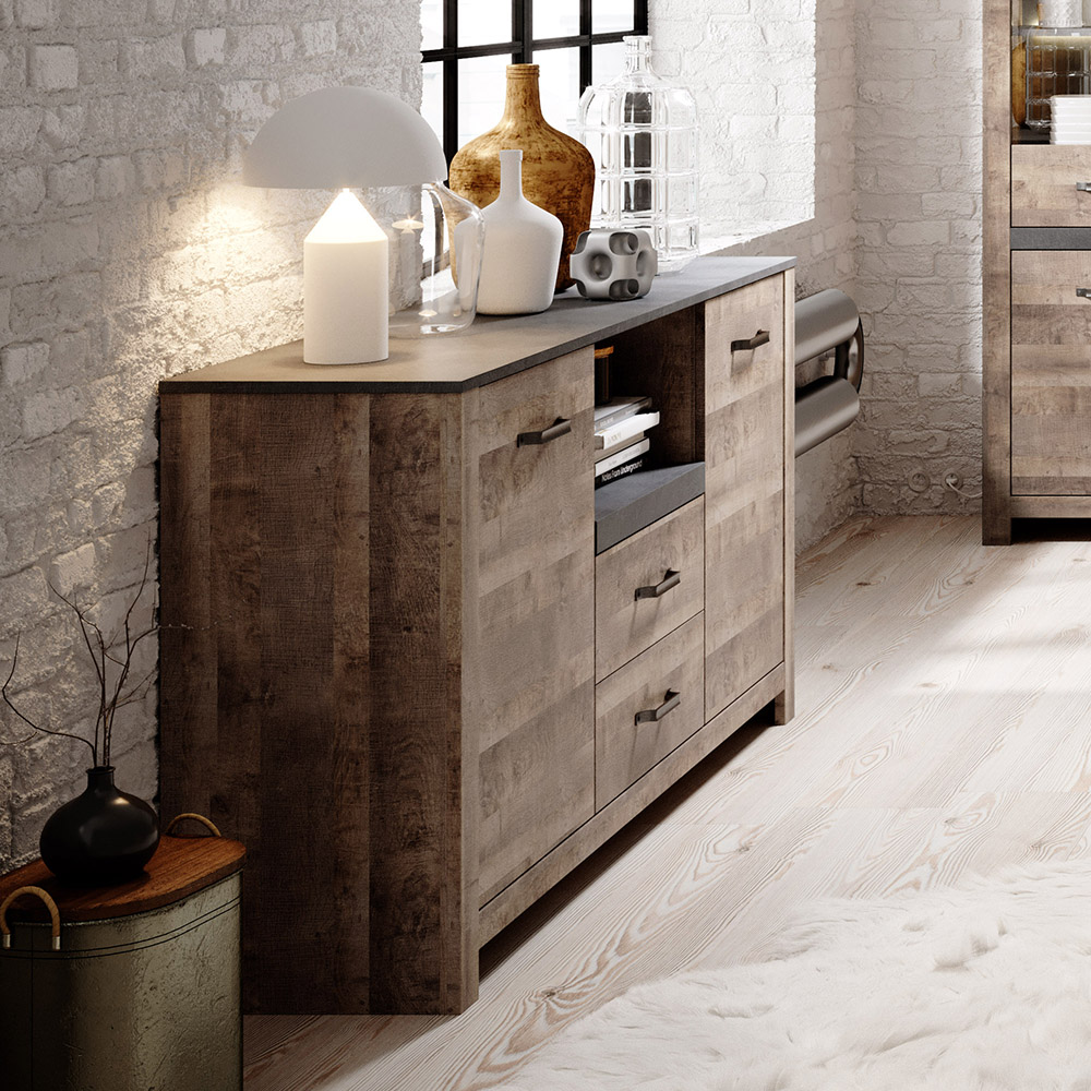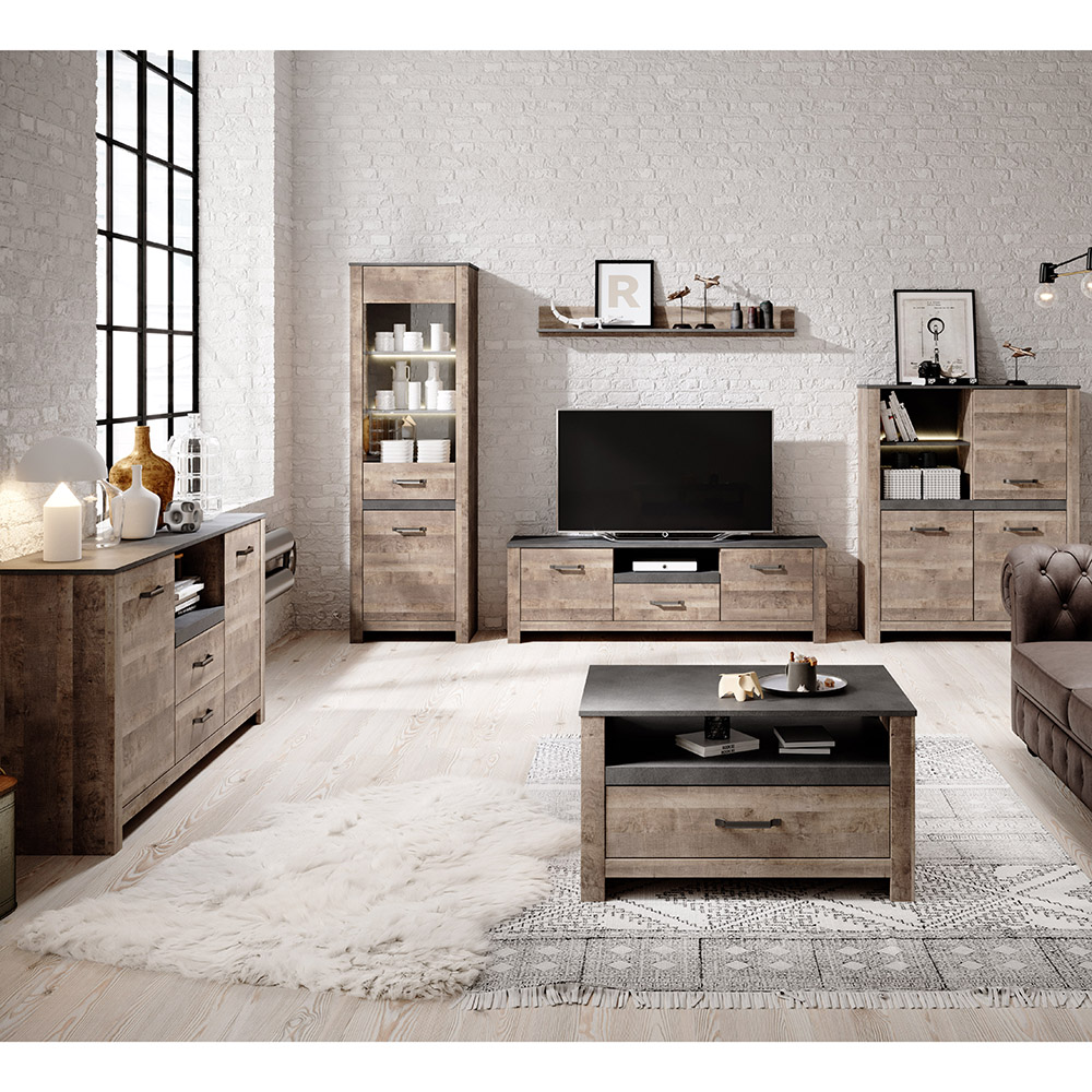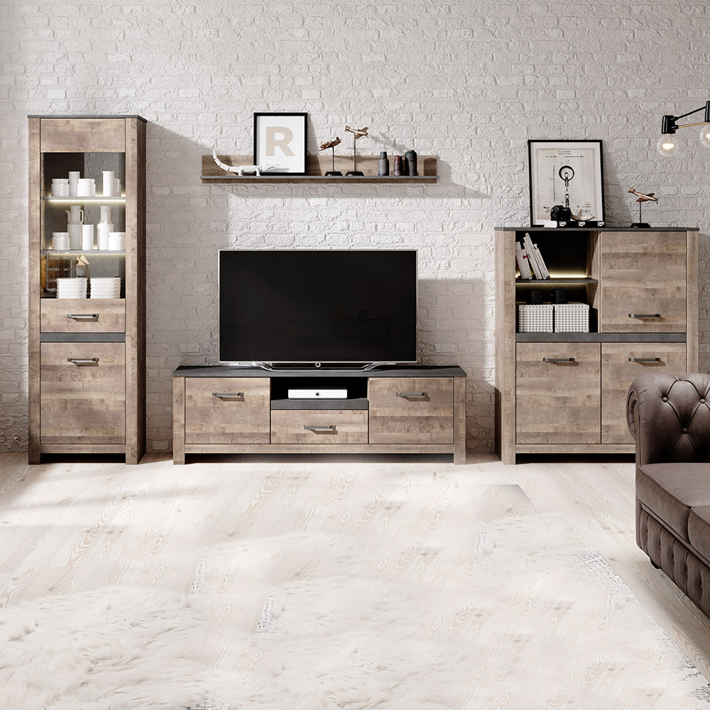 Nábytek SAND představuje velice oblíbený rustikální styl. Barevná kombinace dřevěného dekoru dubu Sand Grange a dekoru materra vytvoří ve Vašem obývacím pokoji harmonické prostředí.