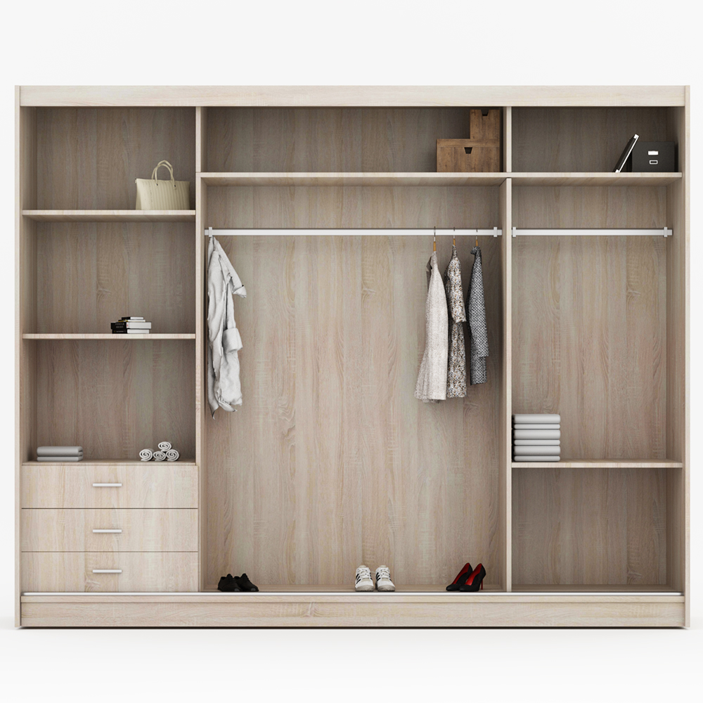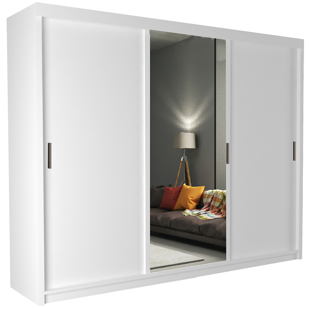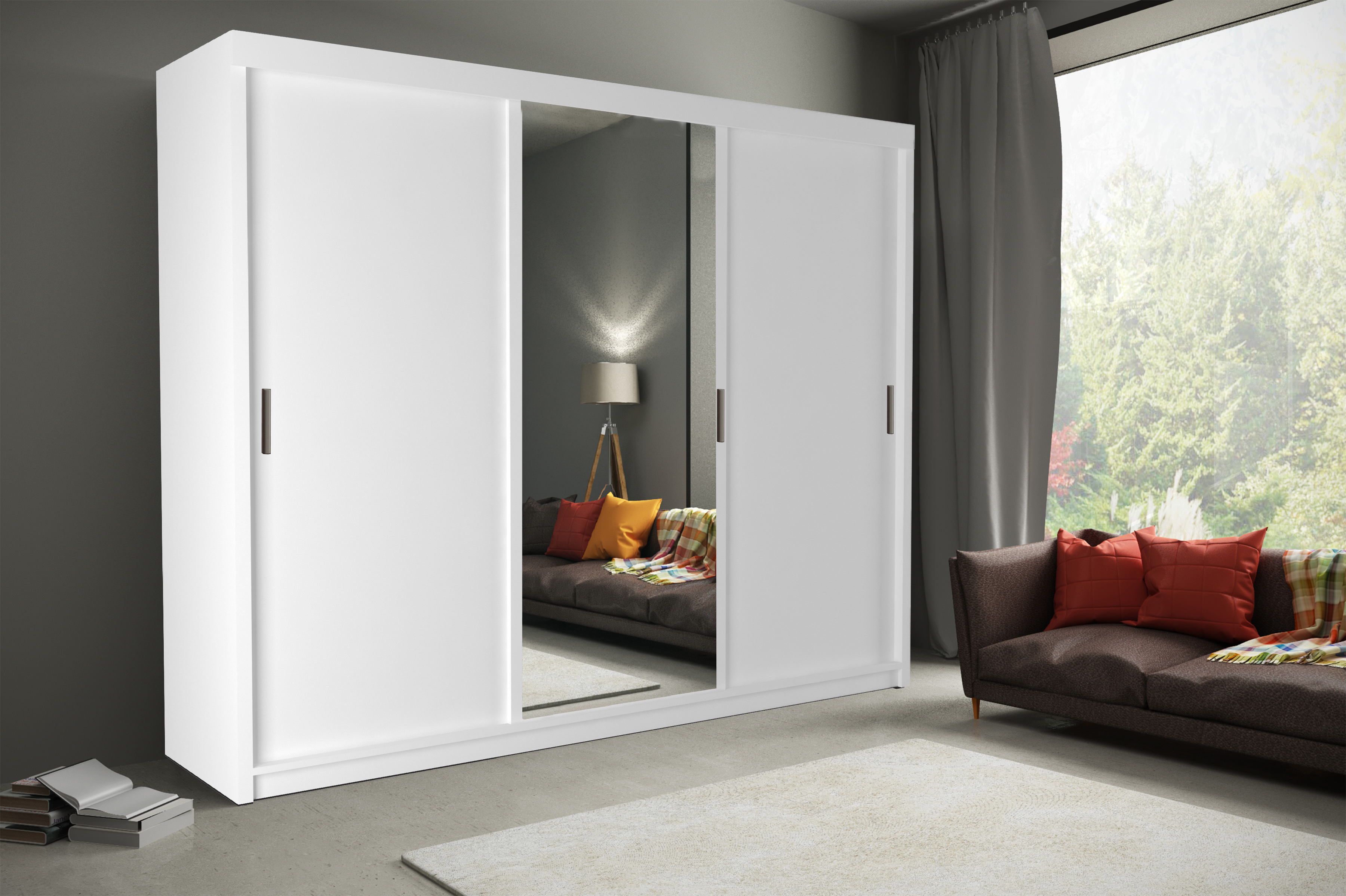 Šatní skříň 250 cm nabízíme v oblíbeném bílém odstínu v kombinaci se zrcadlem. Vnitřek skříně je opatřen policemi, šatními tyčemi na ramínka a zásuvkami. Dveře, kterými skříň disponuje, jsou posuvné a šetří tak prostor v pokoji. Nábytek je vyroben z kvalitní laminátové dřevotřísky. Zboží Vám dodáme v demontu s návodem na sestavení a kováním.