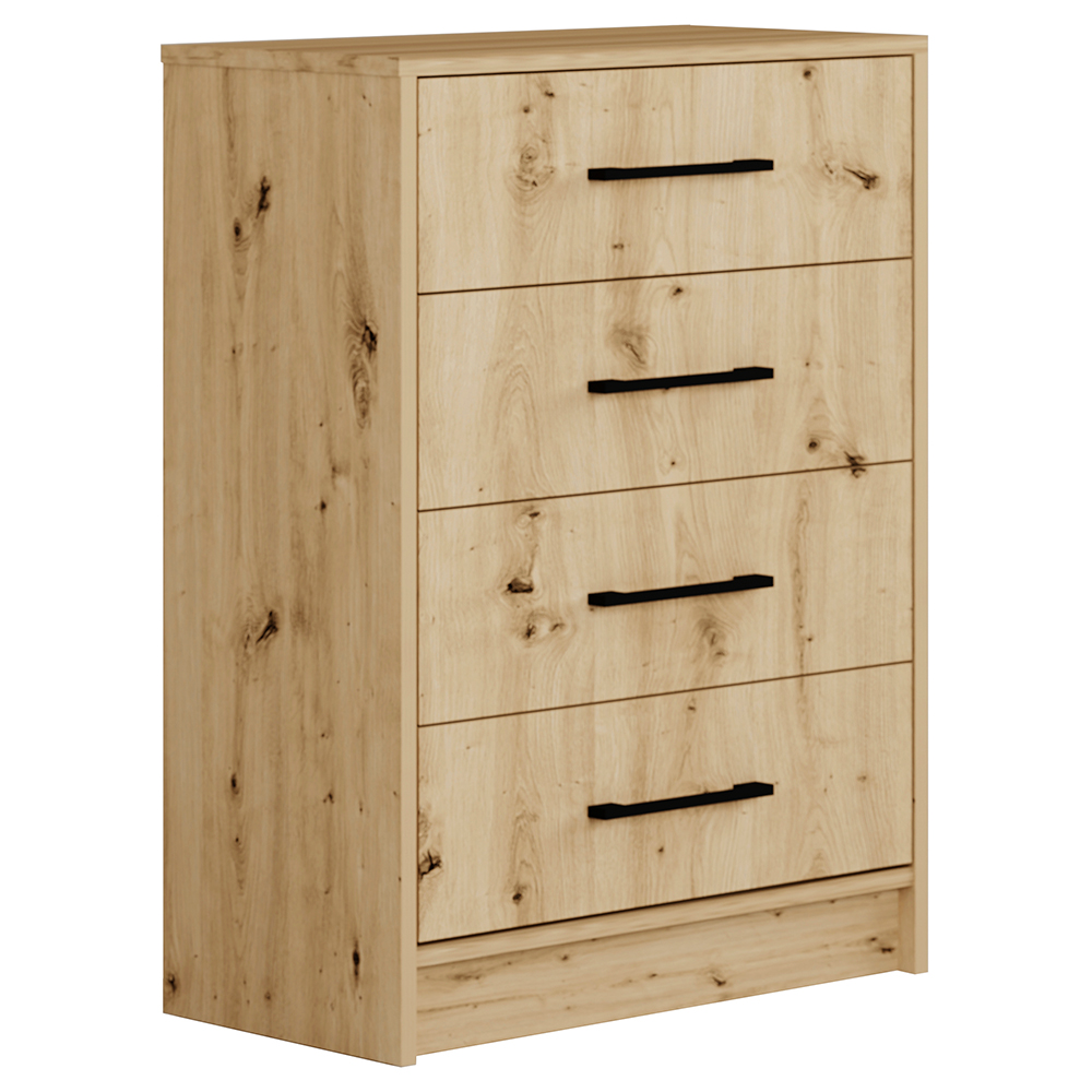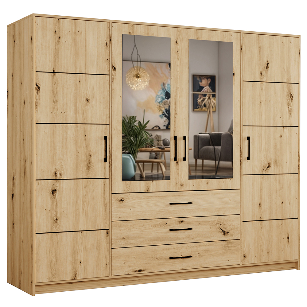 Šatní skříň BELLA 240 v dekoru dub artisan kombinuje moderní vzhled s promyšlenou funkčností. Přírodní odstín dřeva působí teple a útulně, zatímco černé úchyty a dekorativní linky na dveřích dodávají celku moderní kontrast a osobitý styl.