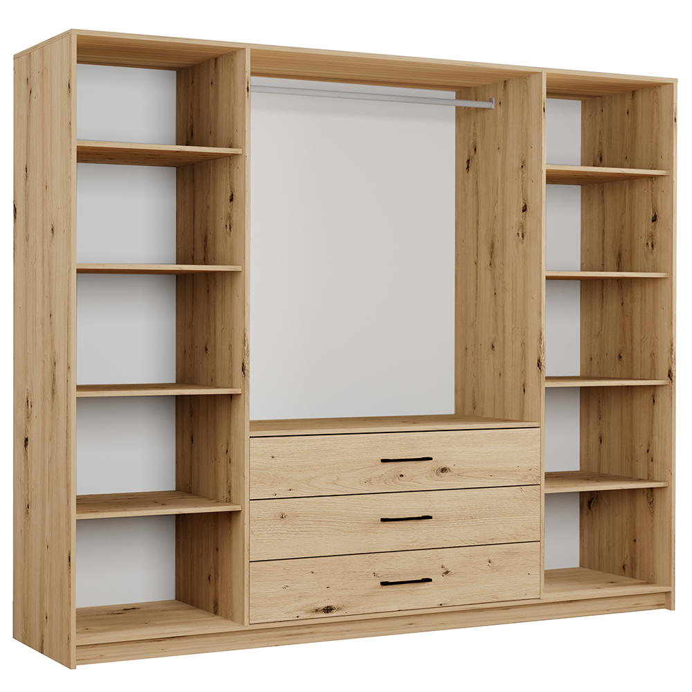 Uvnitř se nachází 8 prostorných polic, které umožňují přehledné rozložení oblečení a doplňků. Součástí je také 1 šatní tyč na ramínka pro kabáty, košile nebo šaty a 3 praktické zásuvky ve spodní části, ideální pro prádlo či doplňky.