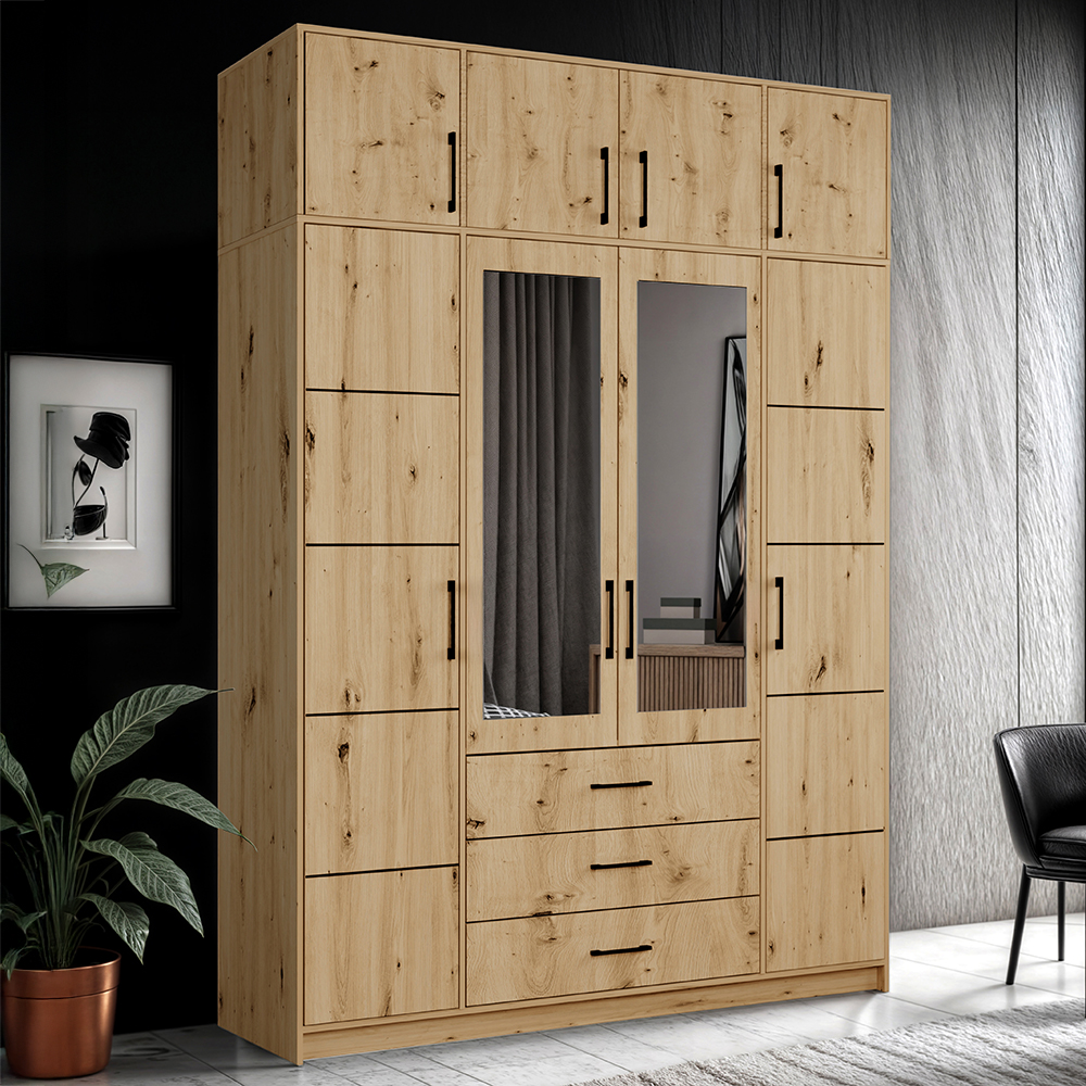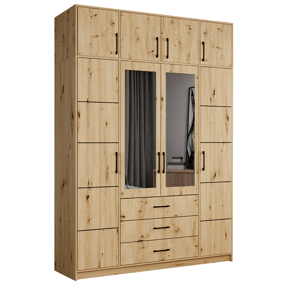 Součástí sestavy je nástavec, který poskytuje další místo pro sezónní oblečení, lůžkoviny nebo kufry. Skříň tak využívá prostor až ke stropu a je ideálním řešením i do menších ložnic či bytů.
