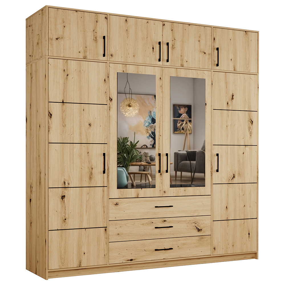 Šatní skříň BELLA 240 s praktickým nástavcem spojuje moderní design, funkčnost a dostatek úložného prostoru. Přírodní dekor dub artisan v kombinaci s černými úchyty a dekorativními linkami na dveřích působí stylově a současně dodává interiéru teplo i útulnost.