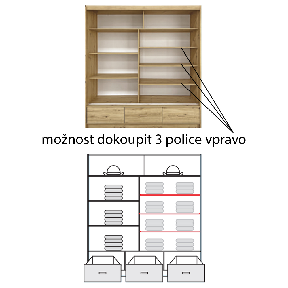 - Možnost rozšíření o 3 přídavné police, díky kterým získáte celopolicovou skříň podle svých potřeb