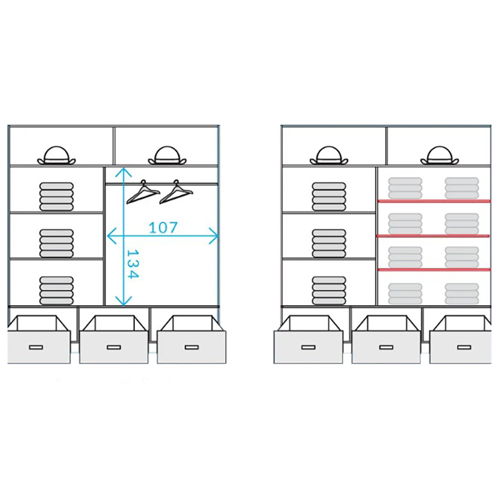 - Možnost rozšíření o 3 přídavné police, díky kterým získáte celopolicovou skříň podle svých potřeb