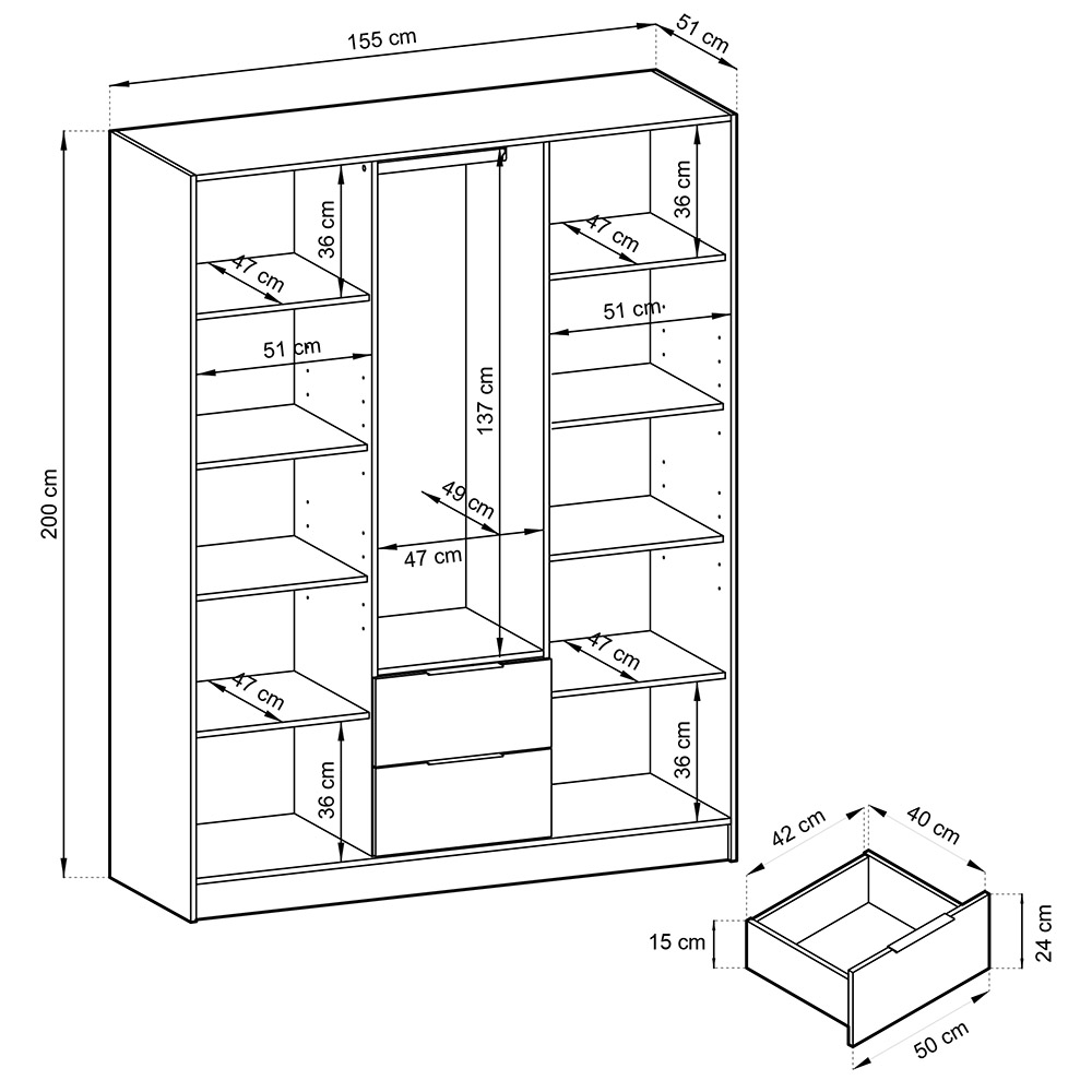 Šatní skříň NELLY 3D disponuje zrcadlem, 2 zásuvkami na drobné oblečení, 8 policemi a šatní tyčí.