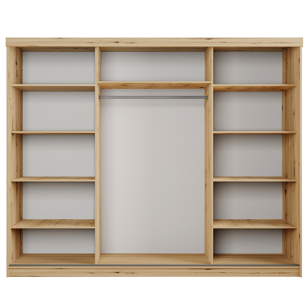 Šatní skříň PALMA 250 zaujme svým elegantním designem a velkorysým úložným prostorem. Kombinace přírodního dekoru dub artisan a zrcadlových posuvných dveří vytváří nadčasový vzhled, který snadno zapadne do moderní ložnice i šatny.