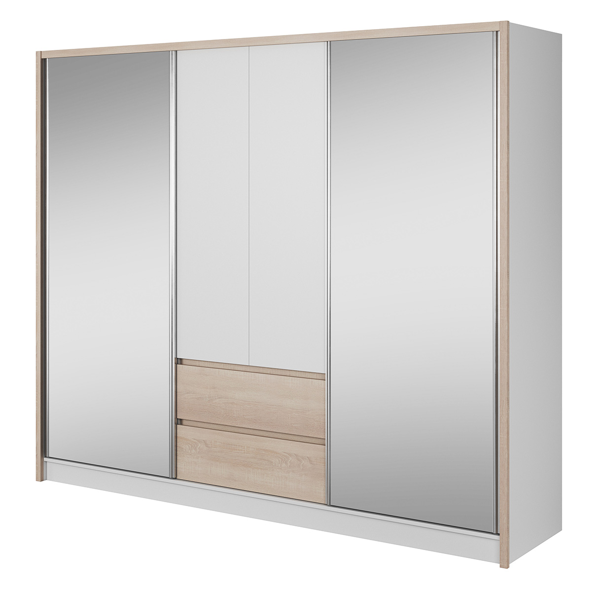 Šatní skříň Sonoma přináší ideální řešení úložného prostoru do Vaší ložnice. Skříň disponuje posuvnými dveřmi, které oceníte hlavně v menších prostorách. Na dveřích jsou umístěna dvě praktická zrcadla. Po stranách dveří jsou upevněné podlouhlé stříbrné lišty, se kterými se dveře posouvají. Součástí skříně jsou šatní tyče, police a dvě zásuvky pro drobné oblečení. Nábytek je vyroben z kvalitní laminátové dřevotřísky o síle 16 mm s ochranou ABS hranou. Šatní skříň Sara nabízíme ve více barevných variantách. Zboží Vám dodáme v demontu s návodem na sestavení a kováním.