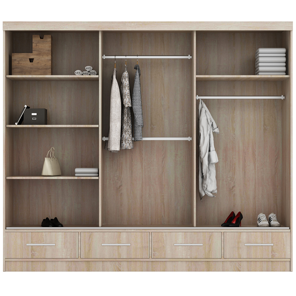 Šatní skříň Sycylia 250 cm nabízíme v luxusním černém odstínu v kombinaci se zrcadlem. Vnitřek skříně je opatřen policemi, šatními tyčemi na ramínka a zásuvkami. Dveře, kterými skříň disponuje, jsou posuvné a šetří tak prostor v pokoji. Nábytek je vyroben z kvalitní laminátové dřevotřísky. Zboží Vám dodáme v demontu s návodem na sestavení a kováním.
