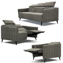 Sedací sestava FUGA je ideální volbou pro ty, kteří hledají stylový nábytek s maximálním komfortem. Tato sestava zahrnuje rozkládací trojpohovku s úložným prostorem, dvojpohovku a křeslo s elektrickým polohováním, které si můžete snadno přizpůsobit pomocí ovládacích tlačítek. Všechny části disponují polohovatelnými záhlavníky a vysokými černými kovovými nožičkami – u trojpohovky o výšce 16 cm a u dvojpohovky, křesla 14 cm.