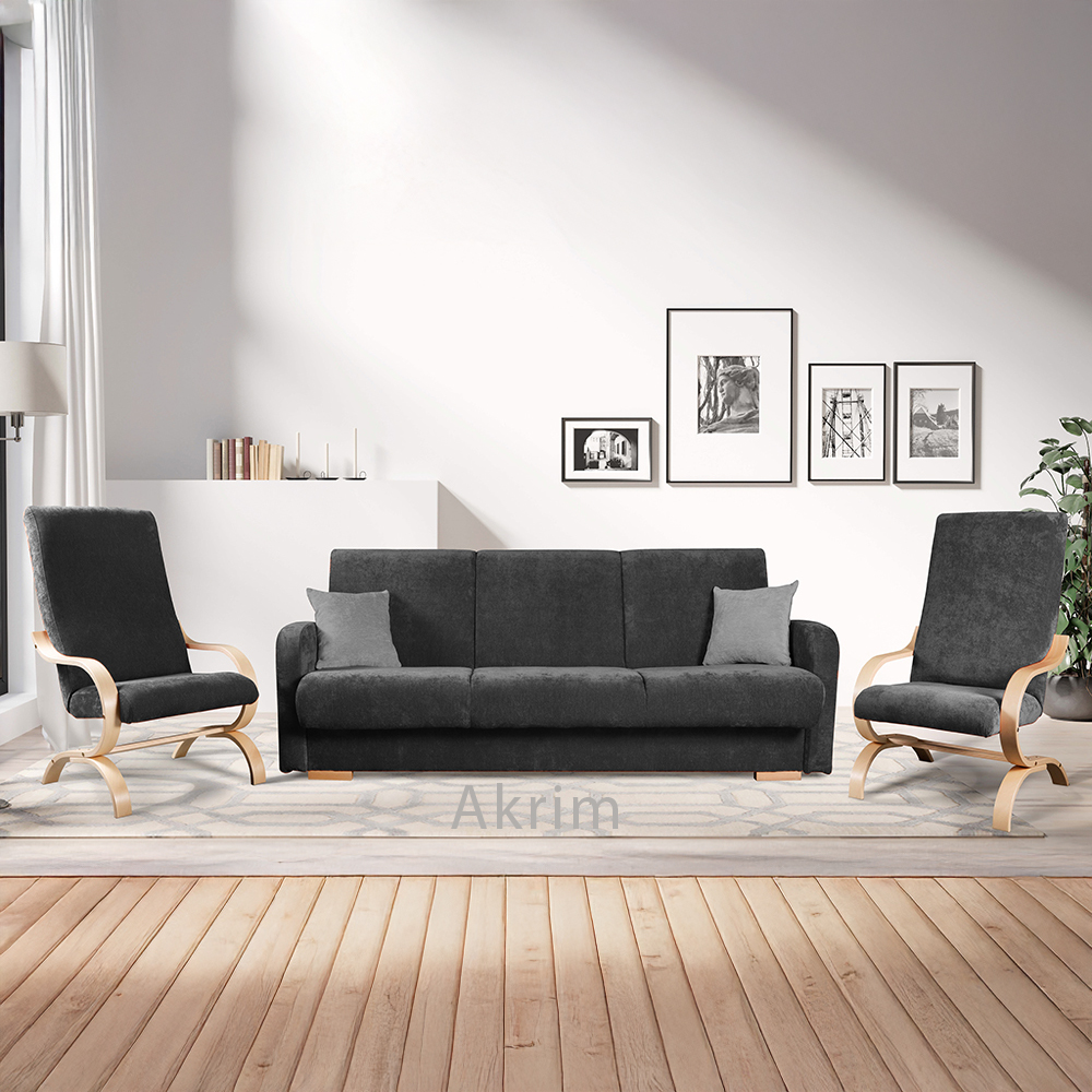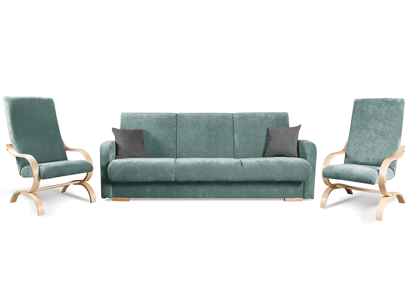 Sedací souprava LIMBA je elegantním a praktickým řešením pro každý obývací pokoj nebo pokoj pro hosty. Sestava se skládá z rozkládací pohovky a dvou pohodlných křesel na podnoži z ohýbaného dřeva, což dodává celému setu nadčasový vzhled a stabilní konstrukci.
