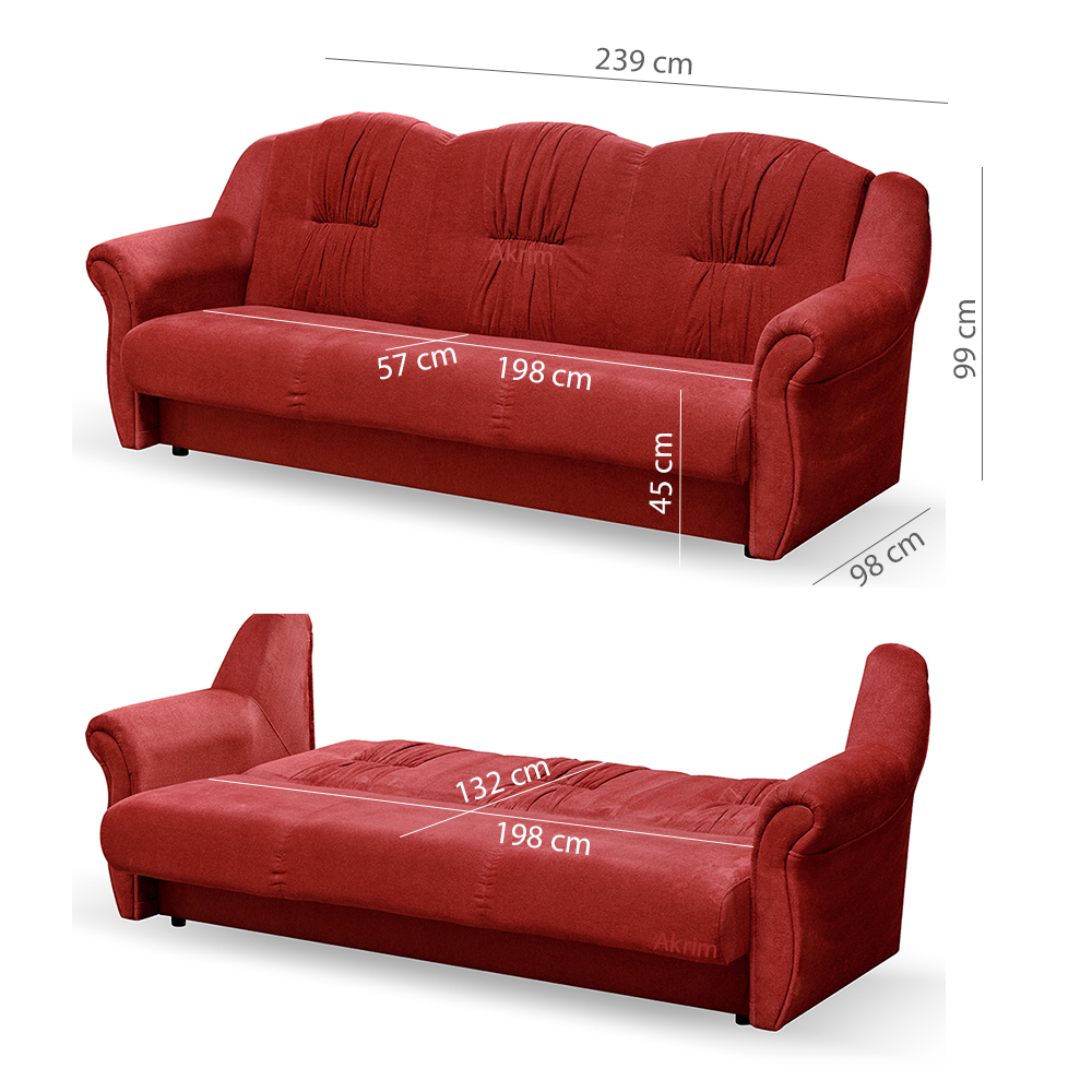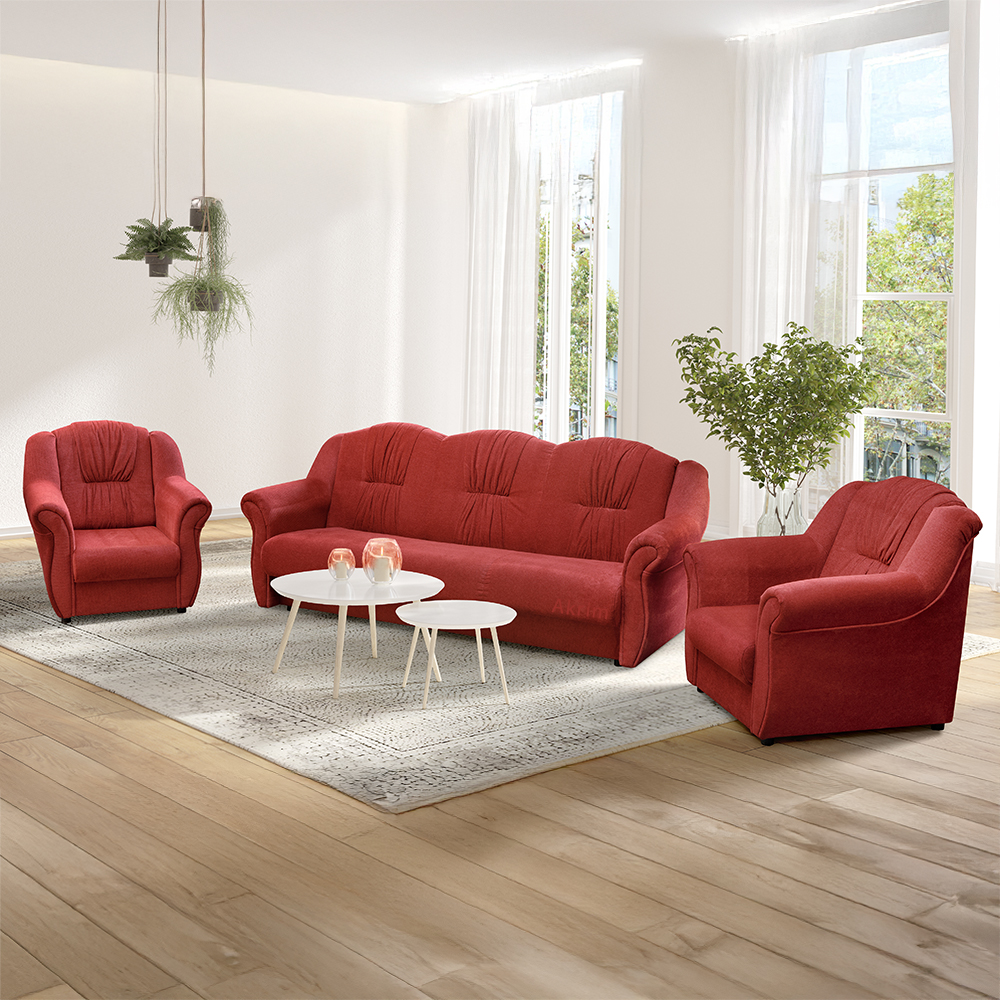 Tato sestava je tvořena 1x pohovkou 3-sedákem a dvěma křesly. Pohovka, tzv. trojsedák je rozkládací s úložným prostorem. Za pomocí mechanismu "klik-klak" v okamžiku připravíte lůžko pro příležitostné spaní. Pod sedací částí naleznete menší úložný prostor, např. na deky nebo polštářky.