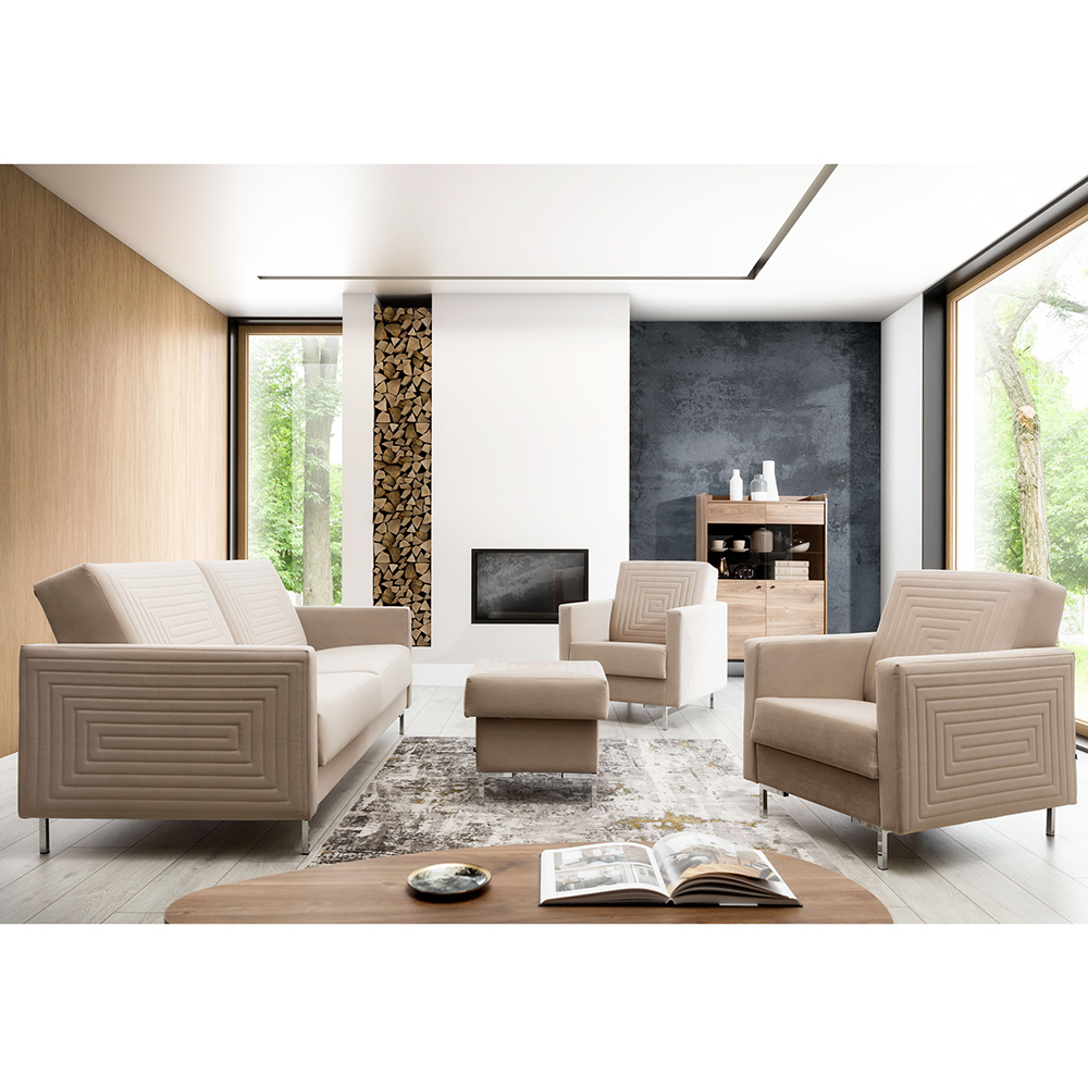 Moderní jednoduchý design se stylovým prošitím na pohovce i křeslech dodává celé sestavě sofistikovaný a atraktivní vzhled. Sedáky pohovky a křesel jsou vyplněny kvalitní PUR pěnou a faliste (vlnitými) pružinami, což zaručuje pevný a pohodlný sed.