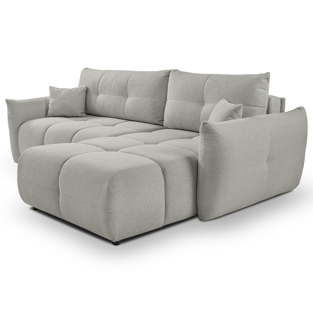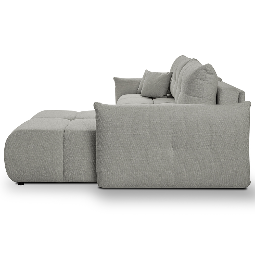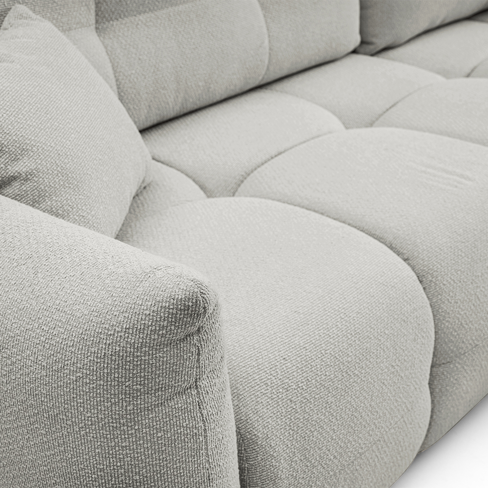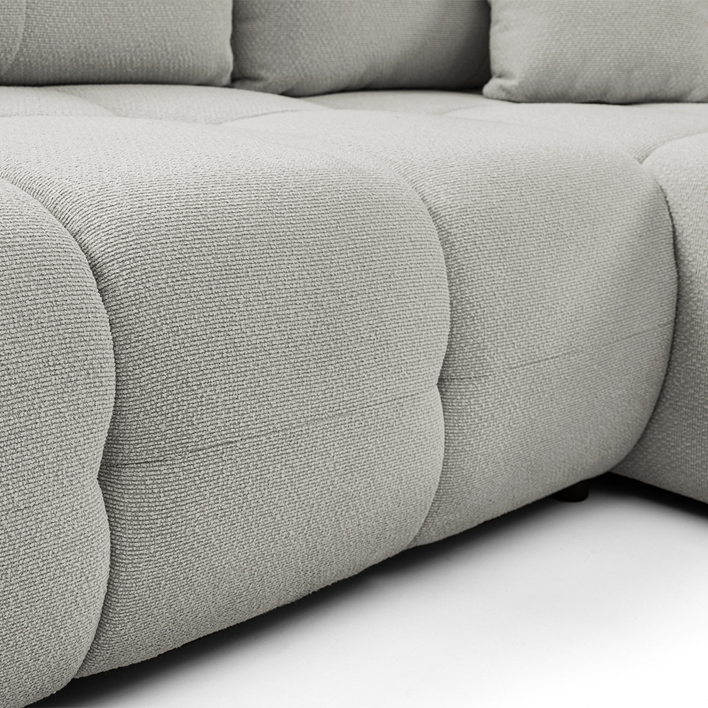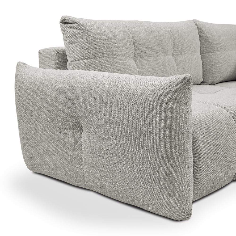 - Bohaté „bochánkové“ prošívání a volné linie vytvářejí ležérní boho atmosféru, která okamžitě zútulní každý interiér. L-kový tvar s jednou područkou a otevřeným koncem nabízí víc místa k sezení, aniž by působil robustně.