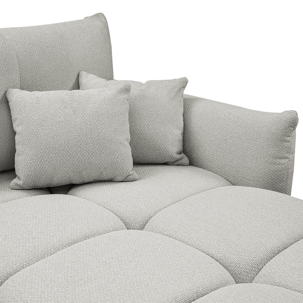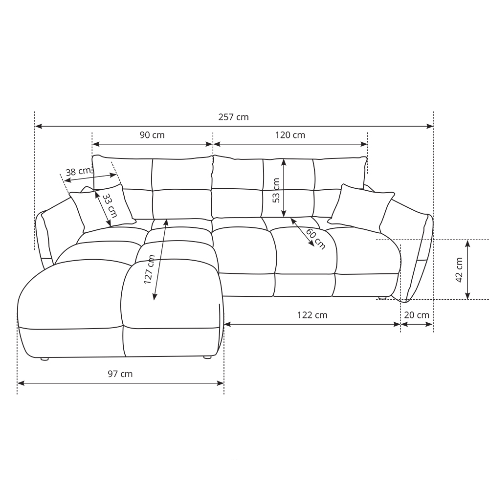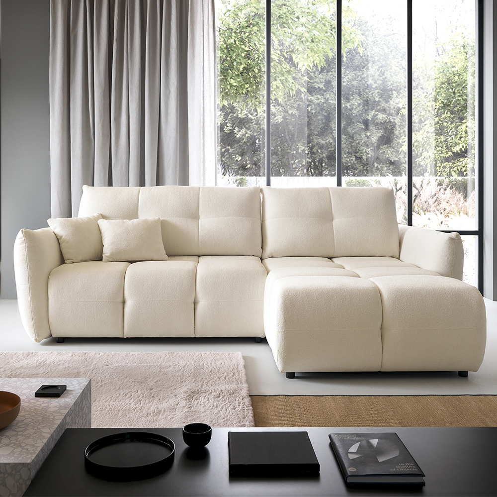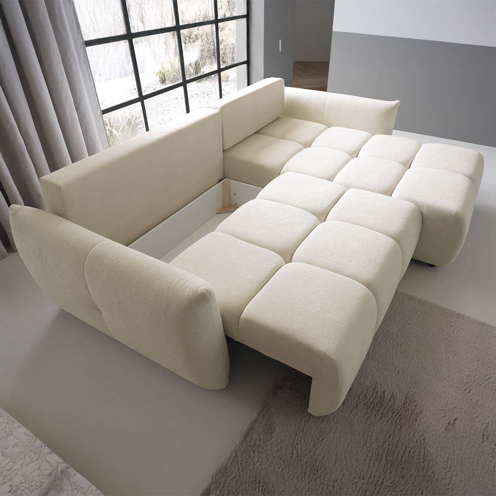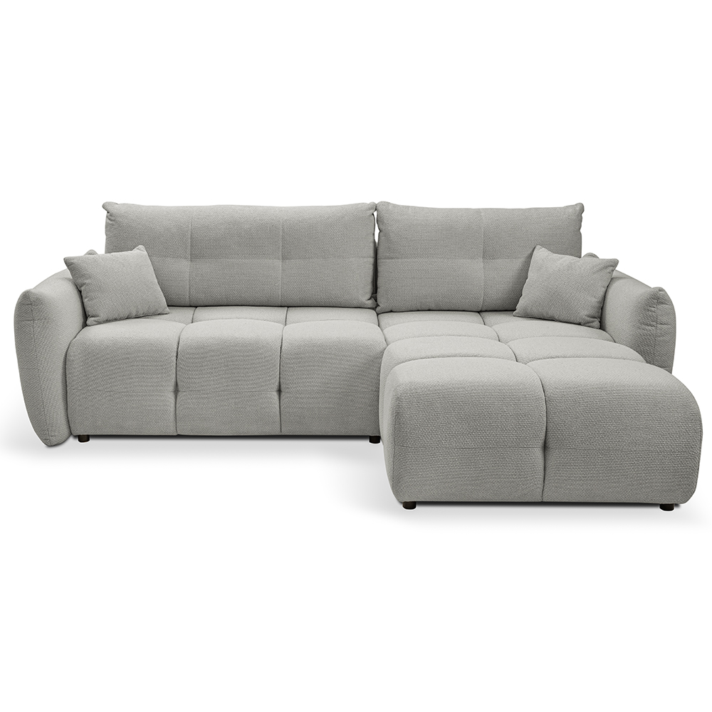 - Bohaté „bochánkové“ prošívání a volné linie vytvářejí ležérní boho atmosféru, která okamžitě zútulní každý interiér. L-kový tvar s jednou područkou a otevřeným koncem nabízí víc místa k sezení, aniž by působil robustně.