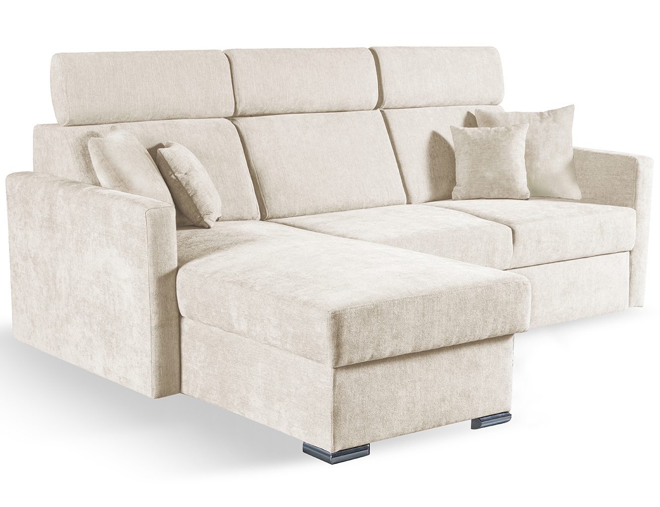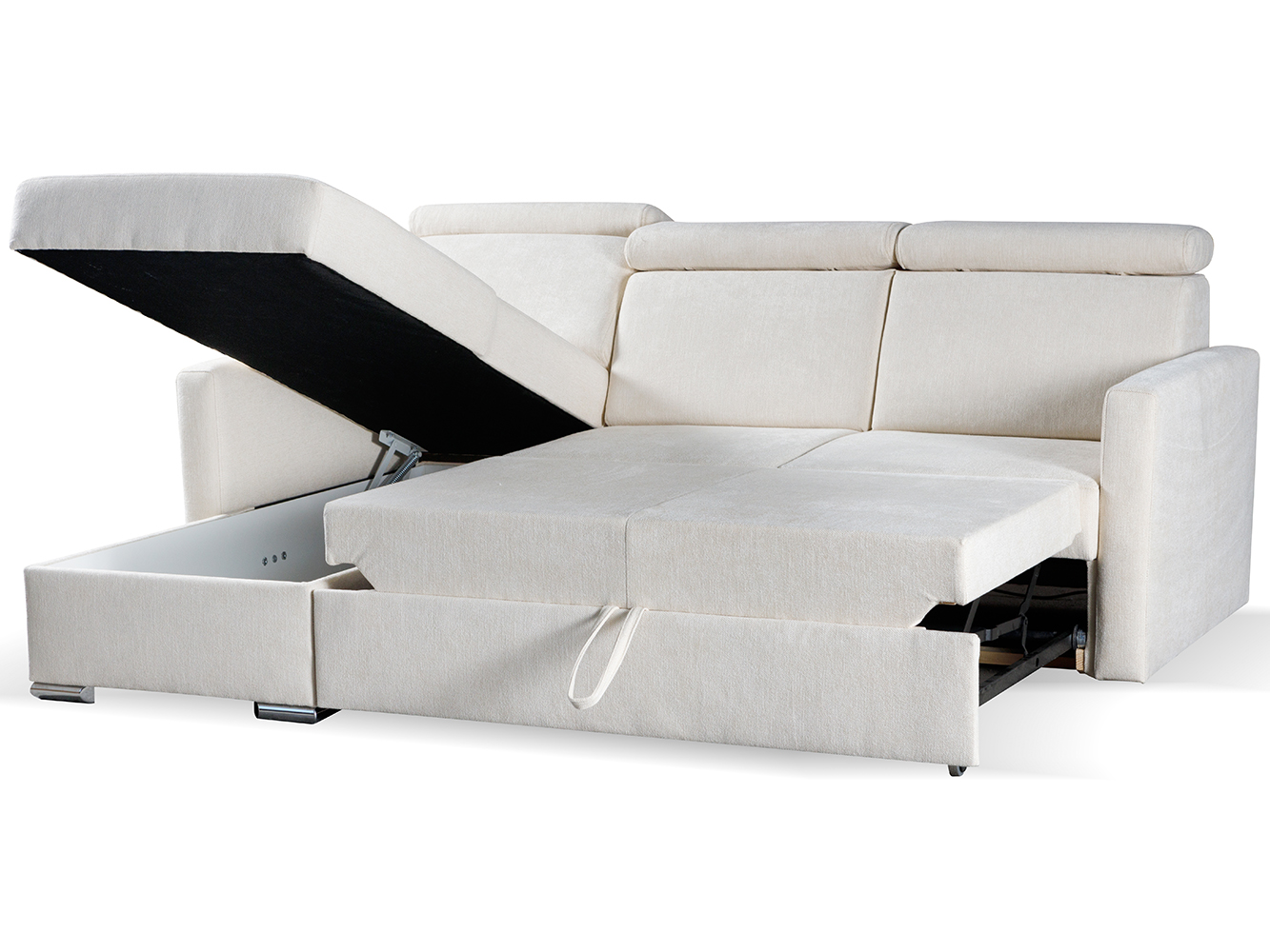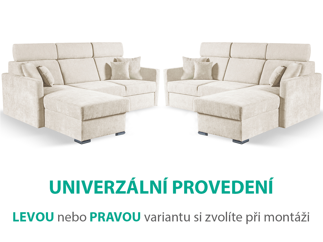 Elegance, pohodlí a nadčasový design, to je rohová rozkládací sedací souprava ROSARIO. Tento hit mezi sedacími soupravami Vám nabízíme v exkluzivním potahovém materiálu, který je díky žinylkové přízi extremně příjemný na omak. Rosario patří do kategoríí tzv. L-kových sedaček univerzálního typu. Kostra sedací soupravy je vyrobena z měkkého a tvrdého dřeva a částečně z dřevotřísky. Pružiny faliste společně s kvalitní polyuretanovou výplňí zajistí pohodlné sezení. Sedací a opěrná část je střední tuhosti, takže vytvoří příjemnou podpěru a zároveň se Vám bude dobře vstávat. Pro větší komfort při relaxaci jsou zádové opěrky opatřeny polohovatelnými záhlavníky, které si nastavíte podle sebe, tak aby se Vám odpočívalo co nejlépe. Zadní část sedací soupravy je očalouněná, takže vypadá velmi pěkně i v otevřeném prostoru. Sedačka se velmi snadno rozkládá a tak můžete během okamžiku vytvořit příležitostné spaní třeba pro hosty. Navíc je rozkládací lůžko počalouněno stejnou potahovou látkou, takže působí vkusně, i když máte sedačku rozloženou. Rosario disponuje i praktickým úložným prostorem z bílého lamina. Úložný prostor je v části pod otomanem, kam můžete schovat např. polštářky nebo deky. Elegantní chromové nohy podtrhují moderní nadčasový design a hodí se tak do každého interiéru. Sedací souprava je univerzální. Umístění otomanu vpravo nebo vlevo si zvolíte až při montáži.