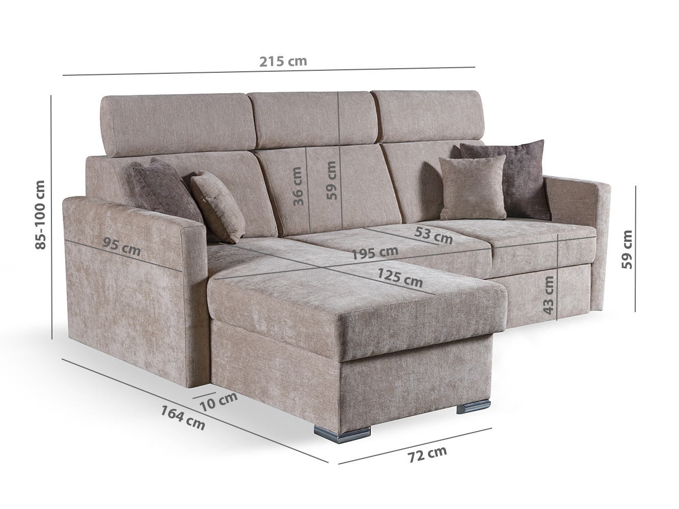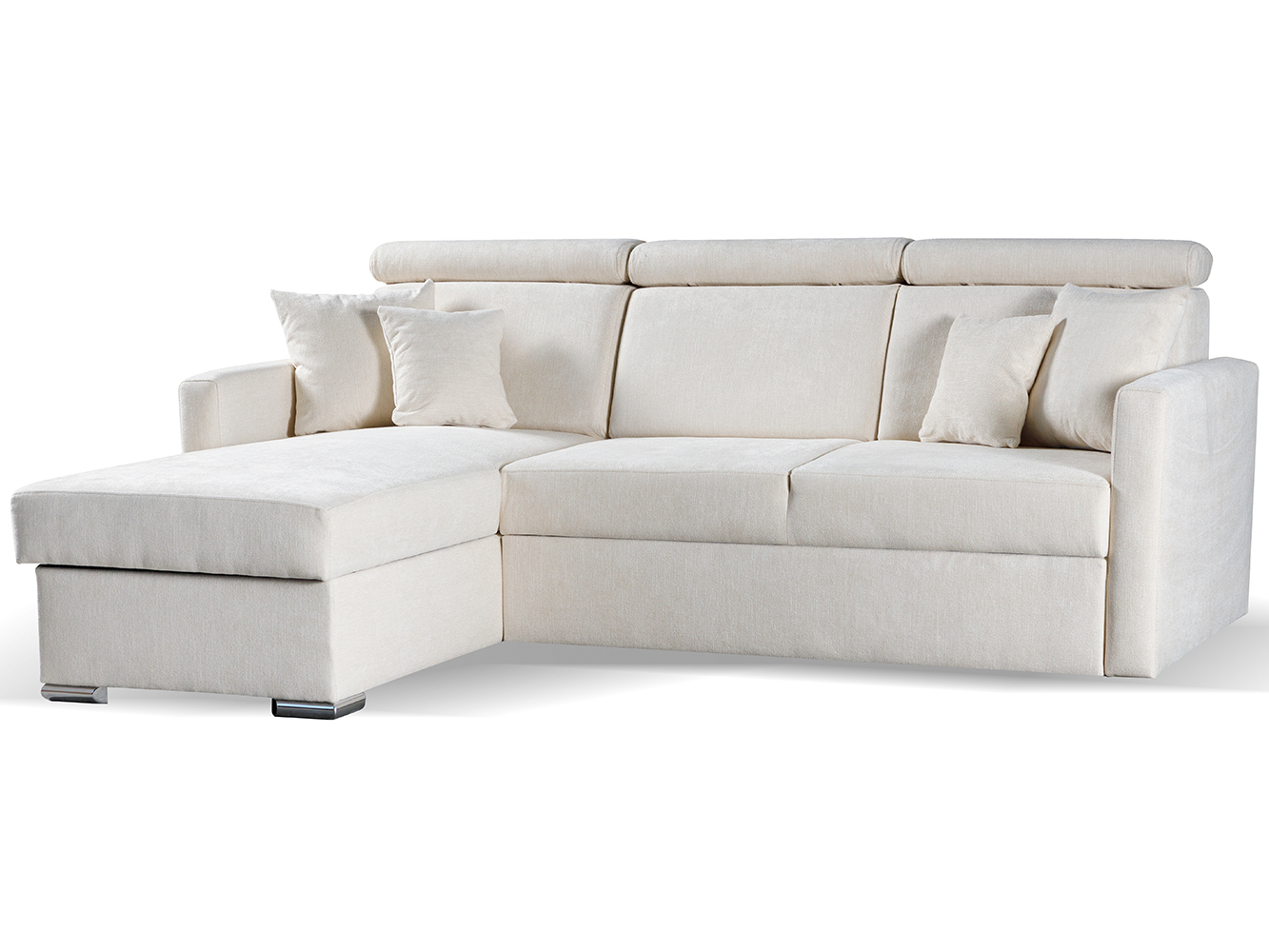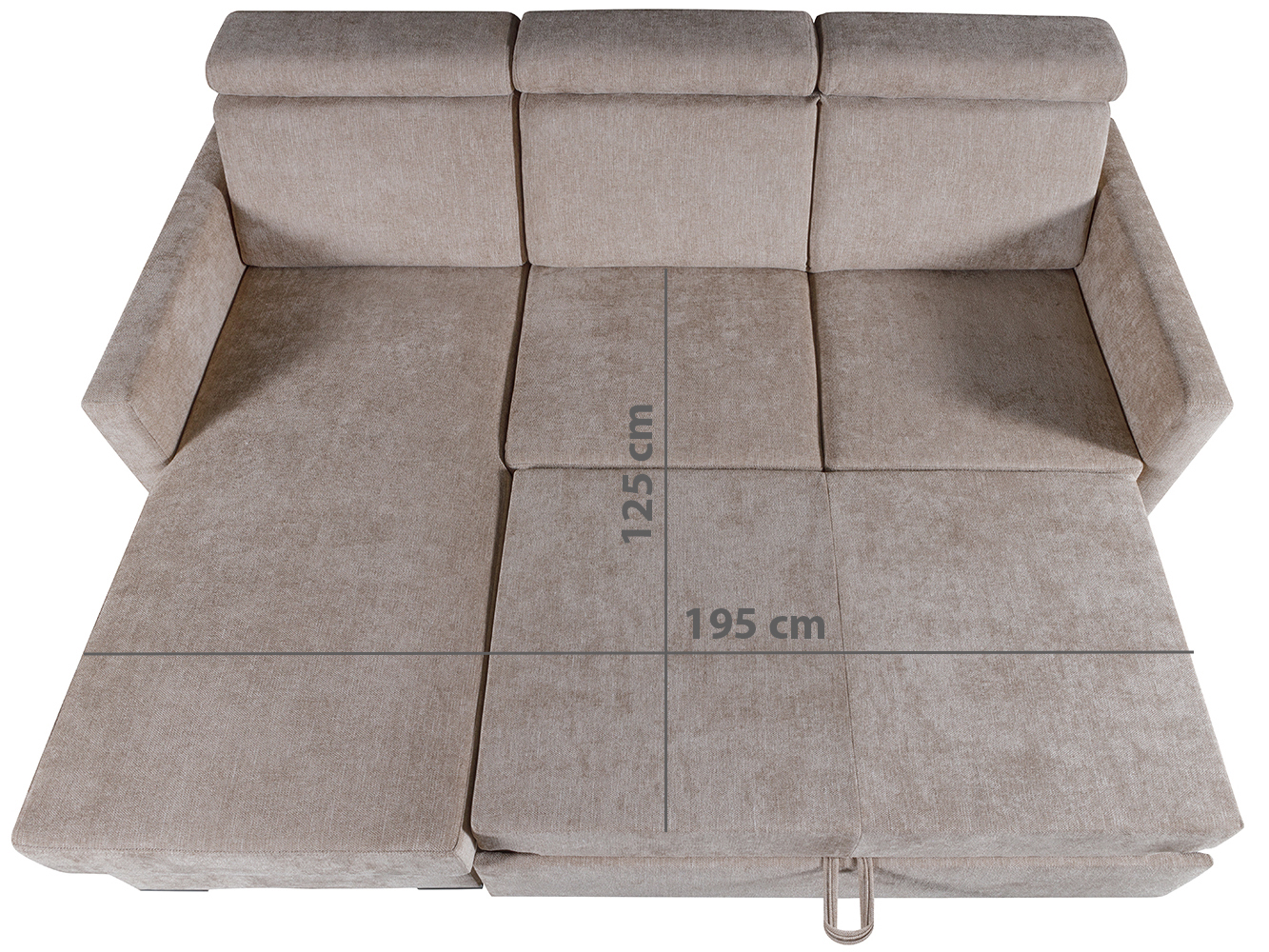 Elegance, pohodlí a nadčasový design, to je rohová rozkládací sedací souprava ROSARIO. Tento hit mezi sedacími soupravami Vám nabízíme v exkluzivním potahovém materiálu, který je díky žinylkové přízi extremně příjemný na omak. Rosario patří do kategoríí tzv. L-kových sedaček univerzálního typu. Kostra sedací soupravy je vyrobena z měkkého a tvrdého dřeva a částečně z dřevotřísky. Pružiny faliste společně s kvalitní polyuretanovou výplňí zajistí pohodlné sezení. Sedací a opěrná část je střední tuhosti, takže vytvoří příjemnou podpěru a zároveň se Vám bude dobře vstávat. Pro větší komfort při relaxaci jsou zádové opěrky opatřeny polohovatelnými záhlavníky, které si nastavíte podle sebe, tak aby se Vám odpočívalo co nejlépe. Zadní část sedací soupravy je očalouněná, takže vypadá velmi pěkně i v otevřeném prostoru. Sedačka se velmi snadno rozkládá a tak můžete během okamžiku vytvořit příležitostné spaní třeba pro hosty. Navíc je rozkládací lůžko počalouněno stejnou potahovou látkou, takže působí vkusně, i když máte sedačku rozloženou. Rosario disponuje i praktickým úložným prostorem z bílého lamina. Úložný prostor je v části pod otomanem, kam můžete schovat např. polštářky nebo deky. Elegantní chromové nohy podtrhují moderní nadčasový design a hodí se tak do každého interiéru. Sedací souprava je univerzální. Umístění otomanu vpravo nebo vlevo si zvolíte až při montáži.
