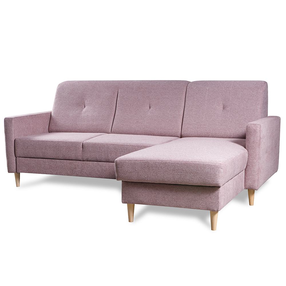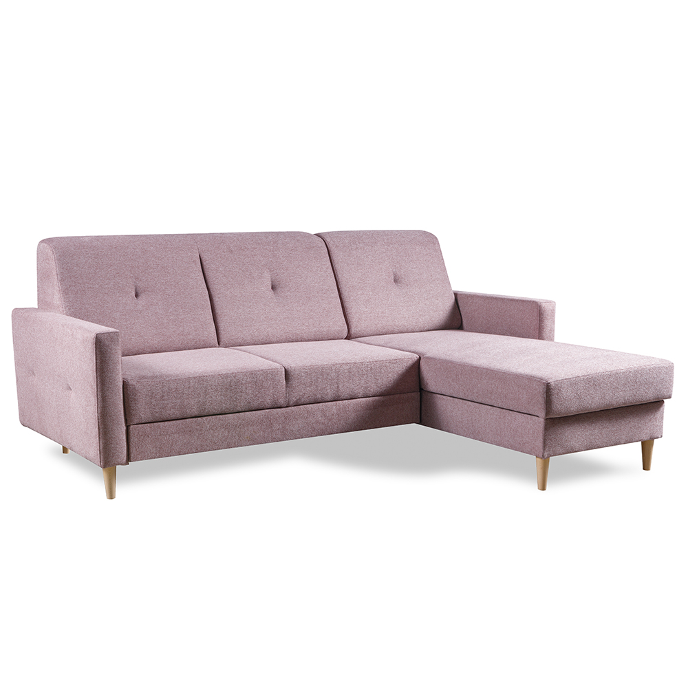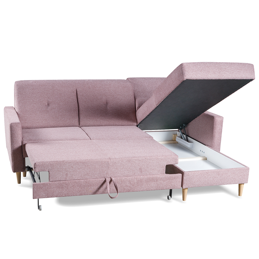 Sedací souprava se za pomocí systému "delfin" snadno rozkládá, proto ve chvilce připravíte lůžko pro příležitostné spaní. Jako bonus je rozkládací lůžko počalouněno stejnou potahovou látkou, takže působí vkusně, i když máte sedačku rozloženou. Její součástí je i praktický úložný prostor z bílého lamina v části pod otomanem, kam můžete uschovat např. deky nebo polštáře.