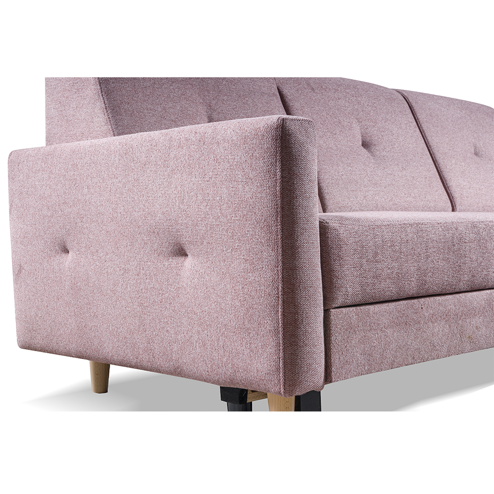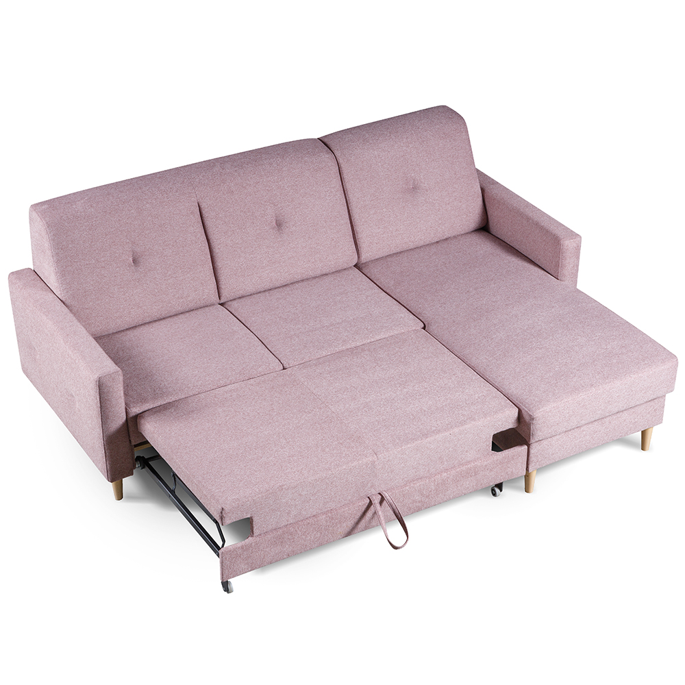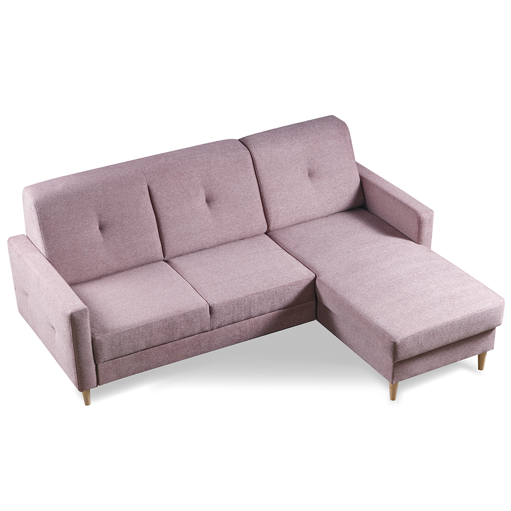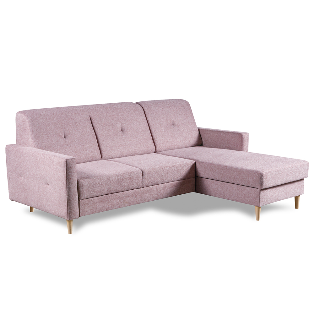 Sedací souprava se za pomocí systému "delfin" snadno rozkládá, proto ve chvilce připravíte lůžko pro příležitostné spaní. Jako bonus je rozkládací lůžko počalouněno stejnou potahovou látkou, takže působí vkusně, i když máte sedačku rozloženou. Její součástí je i praktický úložný prostor z bílého lamina v části pod otomanem, kam můžete uschovat např. deky nebo polštáře.