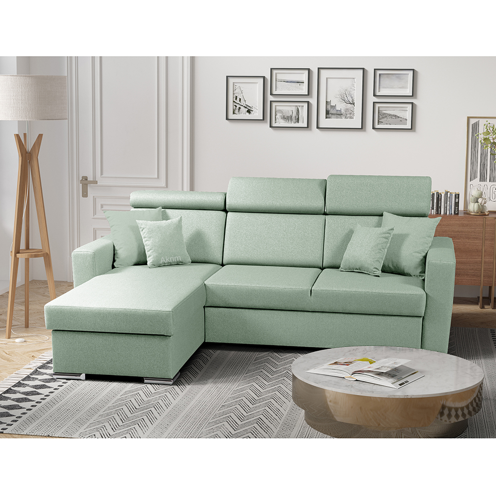 Sedací souprava se snadno rozkládá za pomocí vůzku s matrací a v okamžiku bude připraveno lůžku pro příležitostný spánek. Rozkládací část je navíc jako bonus očalouněná stejnou potahovou látkou, jako sedací souprava. Zajisté využijete i praktický úložný prostor z bílého lamina v části pod otomanem na uschování třeba dek nebo polštářků.