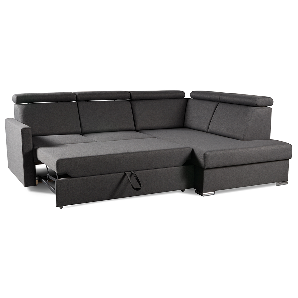 Sedací souprava se snadno rozkládá za pomocí vůzku s matrací a v okamžiku bude připraveno lůžku pro příležitostný spánek. Rozkládací část je navíc jako bonus očalouněná stejnou potahovou látkou, jako sedací souprava. Zajisté využijete i praktický úložný prostor z bílého lamina na uschování třeba dek nebo polštářků.