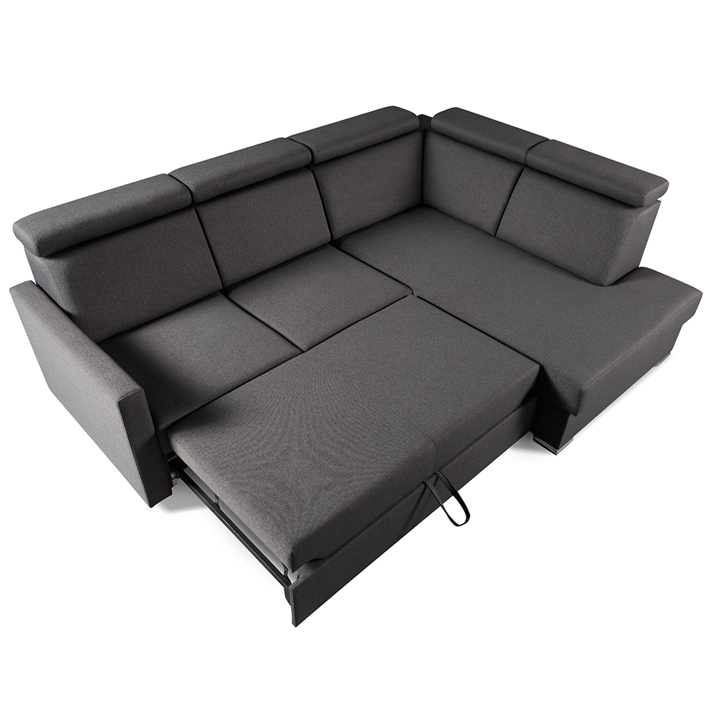 Sedací souprava se snadno rozkládá za pomocí vůzku s matrací a v okamžiku bude připraveno lůžku pro příležitostný spánek. Rozkládací část je navíc jako bonus očalouněná stejnou potahovou látkou, jako sedací souprava. Zajisté využijete i praktický úložný prostor z bílého lamina na uschování třeba dek nebo polštářků.