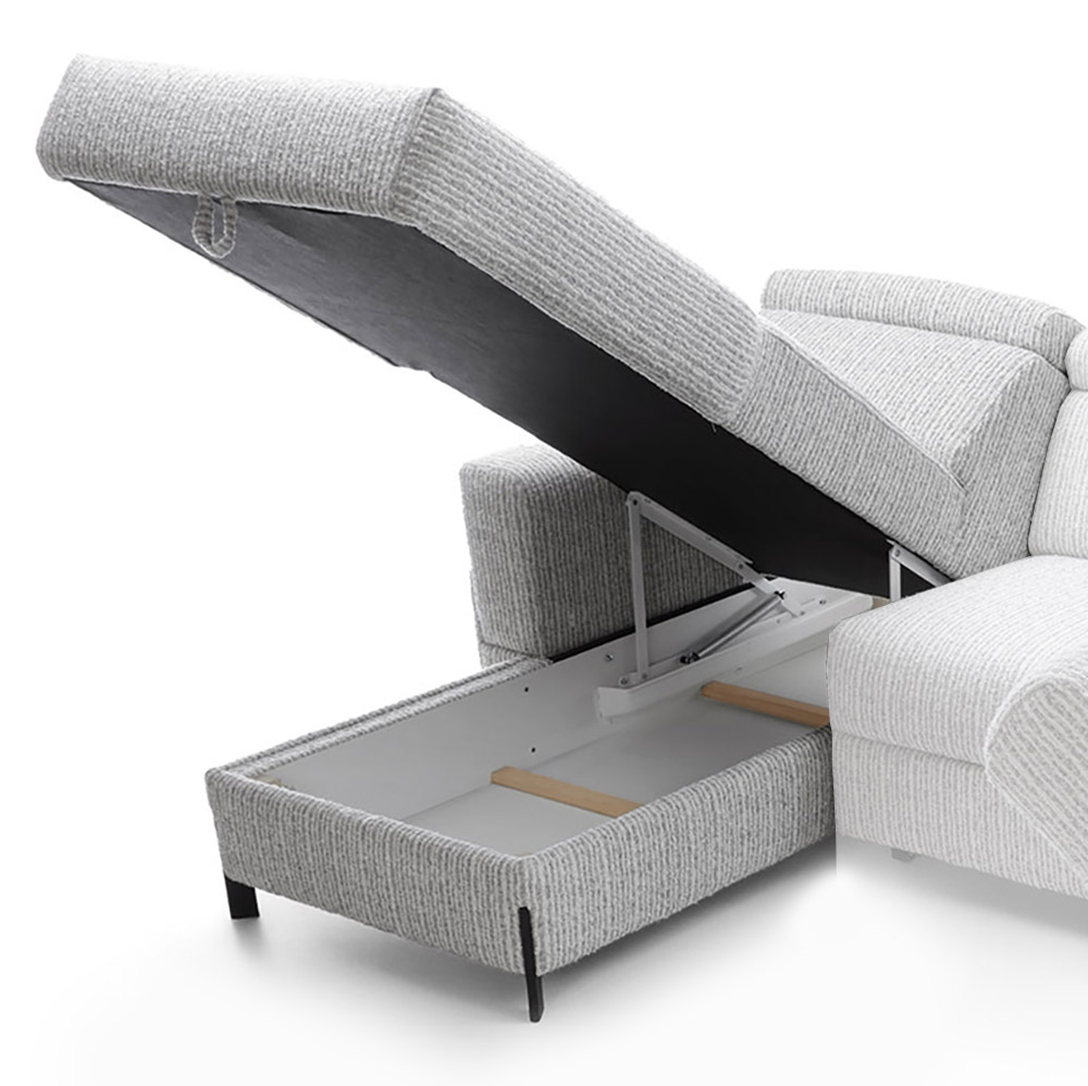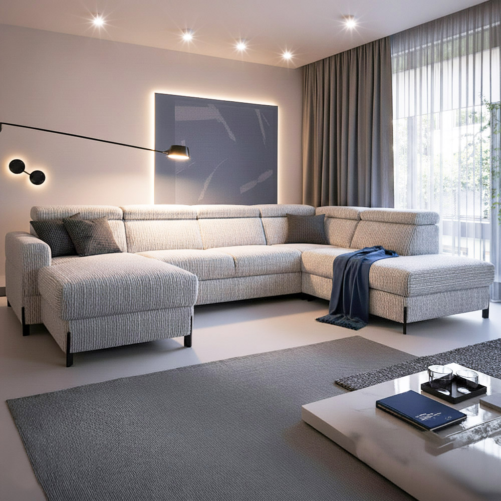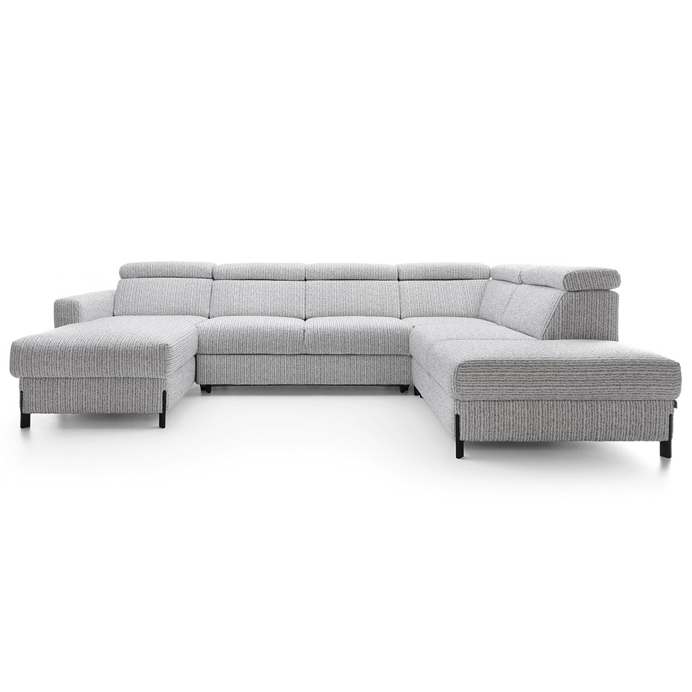 Sedací souprava Ulises ve tvaru U disponuje 2x úložním prostorem, 1x rozkládacím mechanismem na příležitostné přespání a polohovatelnými záhlavníky.