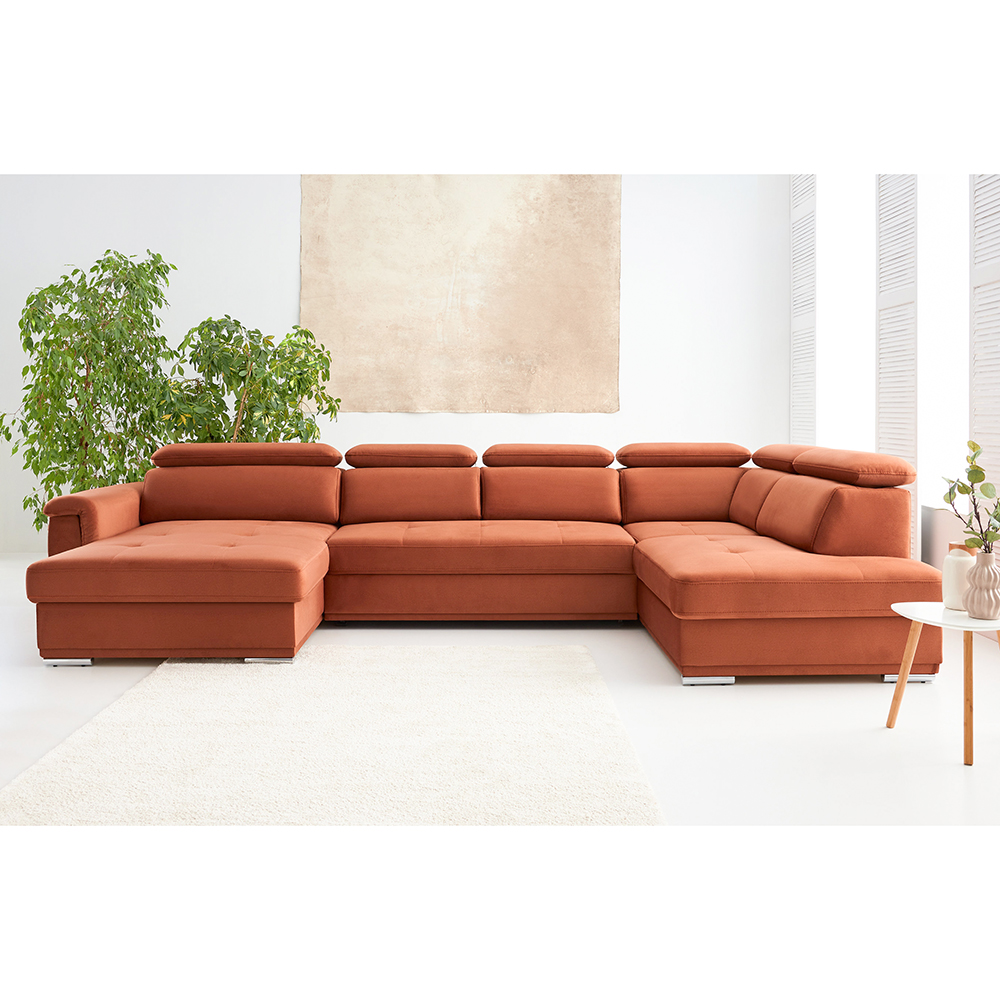 Elegantní sedací souprava Umbria V ve tvaru U Vás zaručeně nadchne svým designem a kvalitním zpracováním. Umbria V si u nás můžete objednat v levé i pravé variantě podle potřeby. Zádové opěrky jsou lehce zešikmené a ergonomicky podpírají bedra při sezení. S polohovatelnými záhlavníky si nastavíte to pravé pohodlý. Sedák tvoří kombinace faliste pružin (vlnité) a vysokoelastické HR pěny. HR pěna vyplňuje také zádovou opěrku a podhlavníky. Umbria V disponuje rozkladem pro každodenní spaní a 2x úložným prostorem pod otmany. Při rozkladu vznikne velká spací plocha 303x124 cm. Sedací soupravu si můžete vybrat v libovolné tkanině ze vzorníku. Stejně tak si lze zvolit i nožičky. Nabízíme dřevěné nožičky v několika odstínech nebo kovové nožičky, které jsou vhodné do každého interiéru. Pokud byste potřebovali poradit s výběrem tkaniny, neváhejte se na nás obrátit. Vše s Vámi prokonzultujeme a případně zašleme i několik odstřižků tkanin pro lepší představu. S výběrem Vám zajisté pomůže i náš průvodce tkaninami. Nábytek Vám dodáme ve 3 balíkách. Doručení máte u této sedací soupravy od nás zdarma. Zboží Vám doručíme vlastní dopravou s dvojčlennou osádkou. S řidiči se můžete domluvit i na výnosu a případně na sestavení sedací soupravy přímo na místo v obývacím pokoji. Nemusíte si tedy dělat starosti s tím, jak dostanete nábytek do domu.