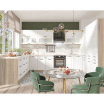 Kolekce kuchyňské linky Smart v bílém matu přináší stylové skříňky s ozdobnými profilovanými dvířky. Oblíbená kombinace dřevěného dekoru, bílých dvířek a černých kovových úchytů vytvoří příjemné a elegantní prostředí, ve kterém budete s radostí vařit. Modulová kuchyňská linka Smart nabízí celou řadu jednotlivých dílů, ze kterých si naplánujete kuchyni podle svých představ. Korpus skříněk si můžete vybrat z několika dřevěných dekorů.